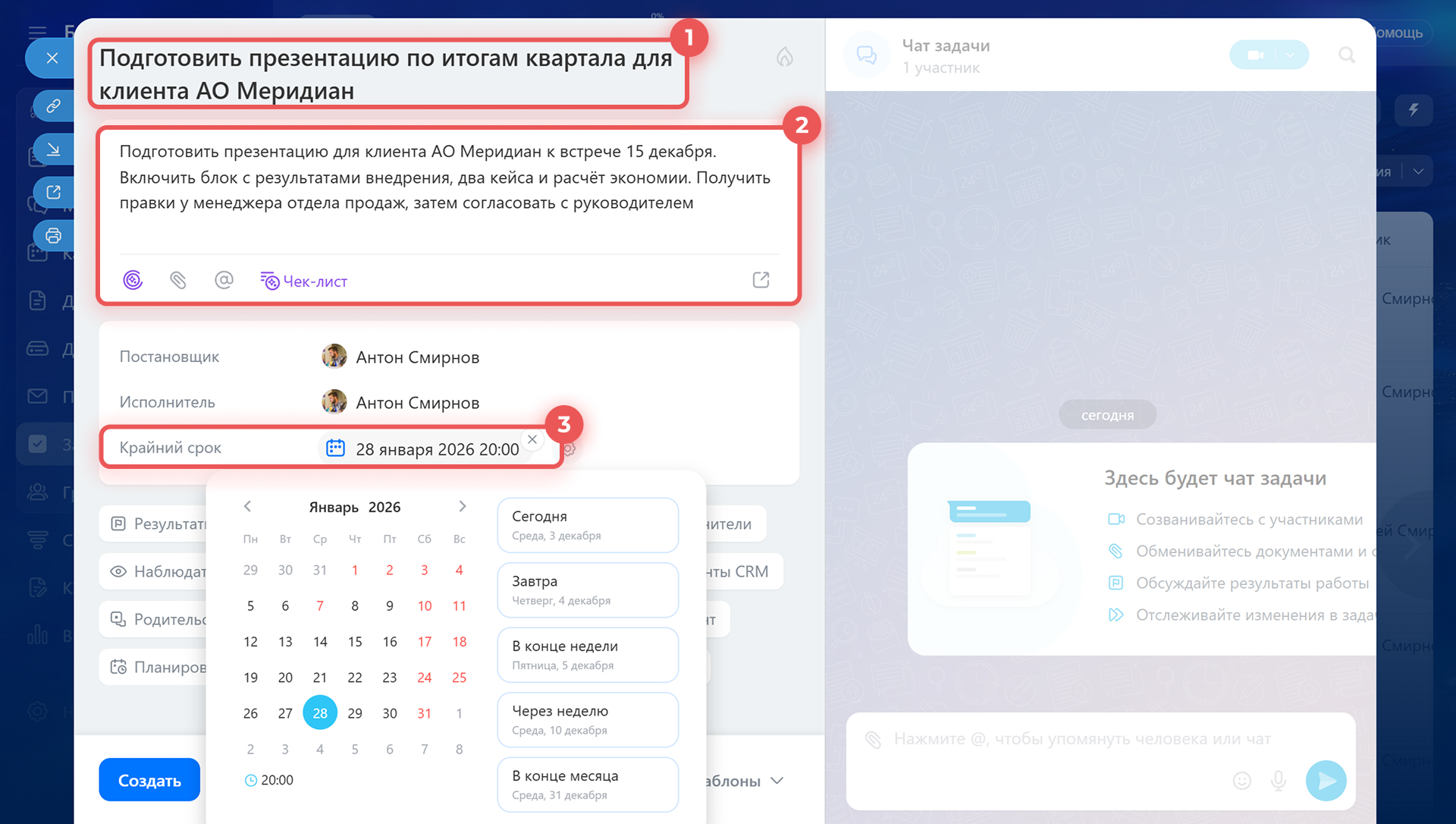 Крайний срок и настройки задачи. Укажите дату и время, к которым задача должна быть выполнена. Можно выбрать готовый вариант или отметить нужную дату в календаре.