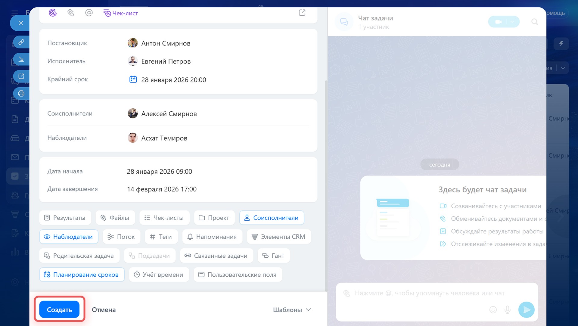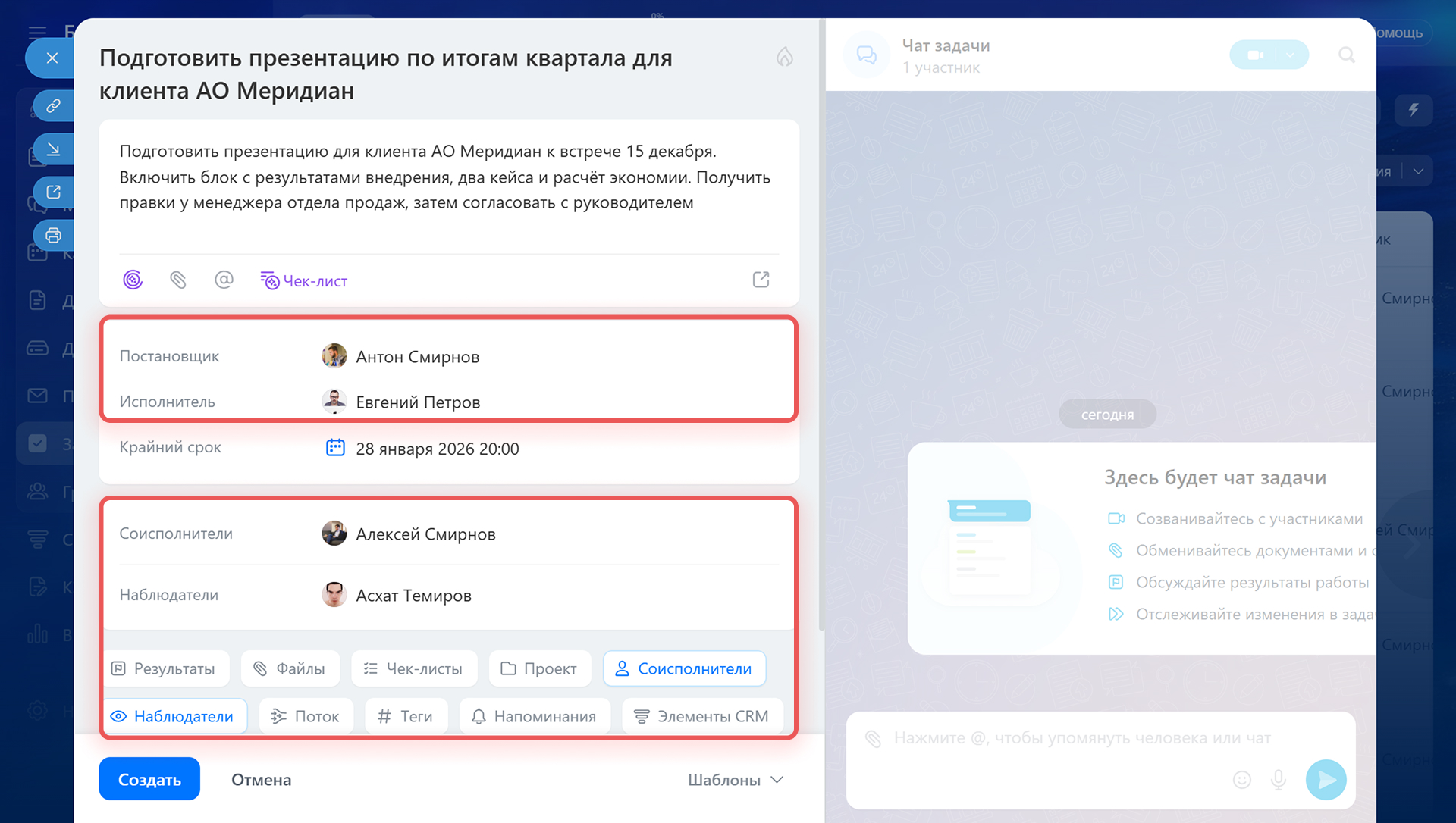 - Соисполнителей и наблюдателей — добавьте тех, кто помогает выполнять задачу или просто следит за ходом работы.