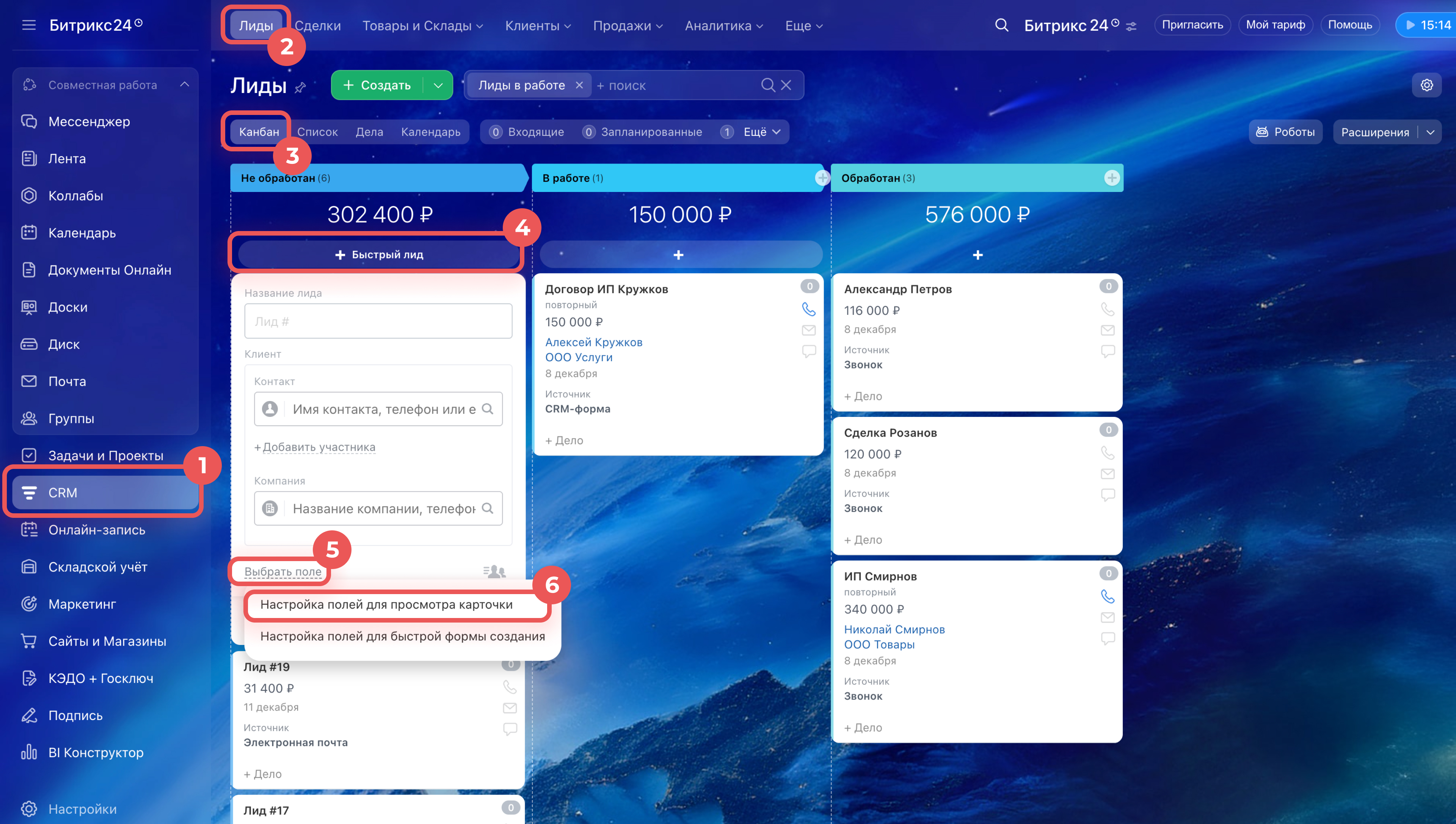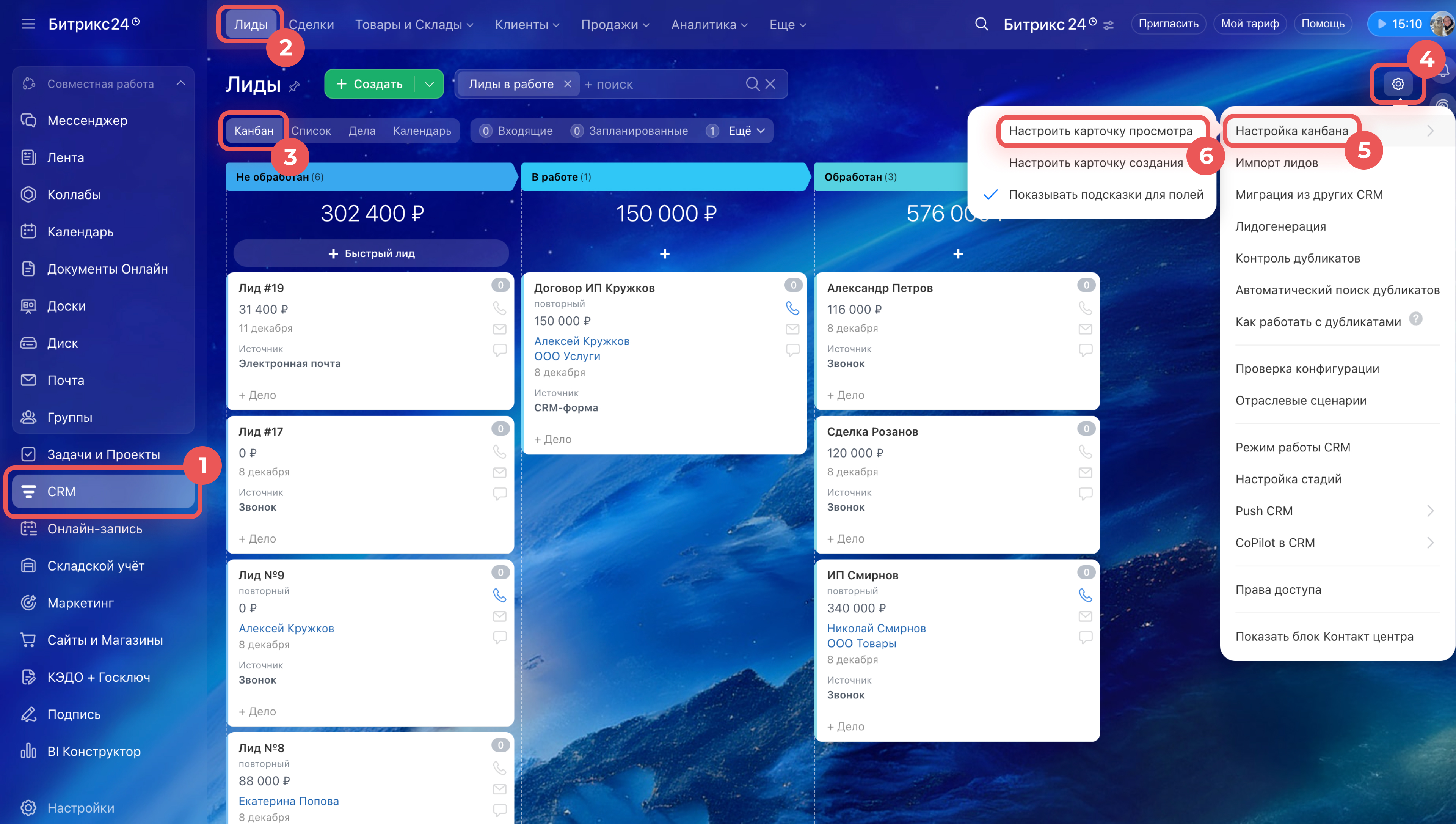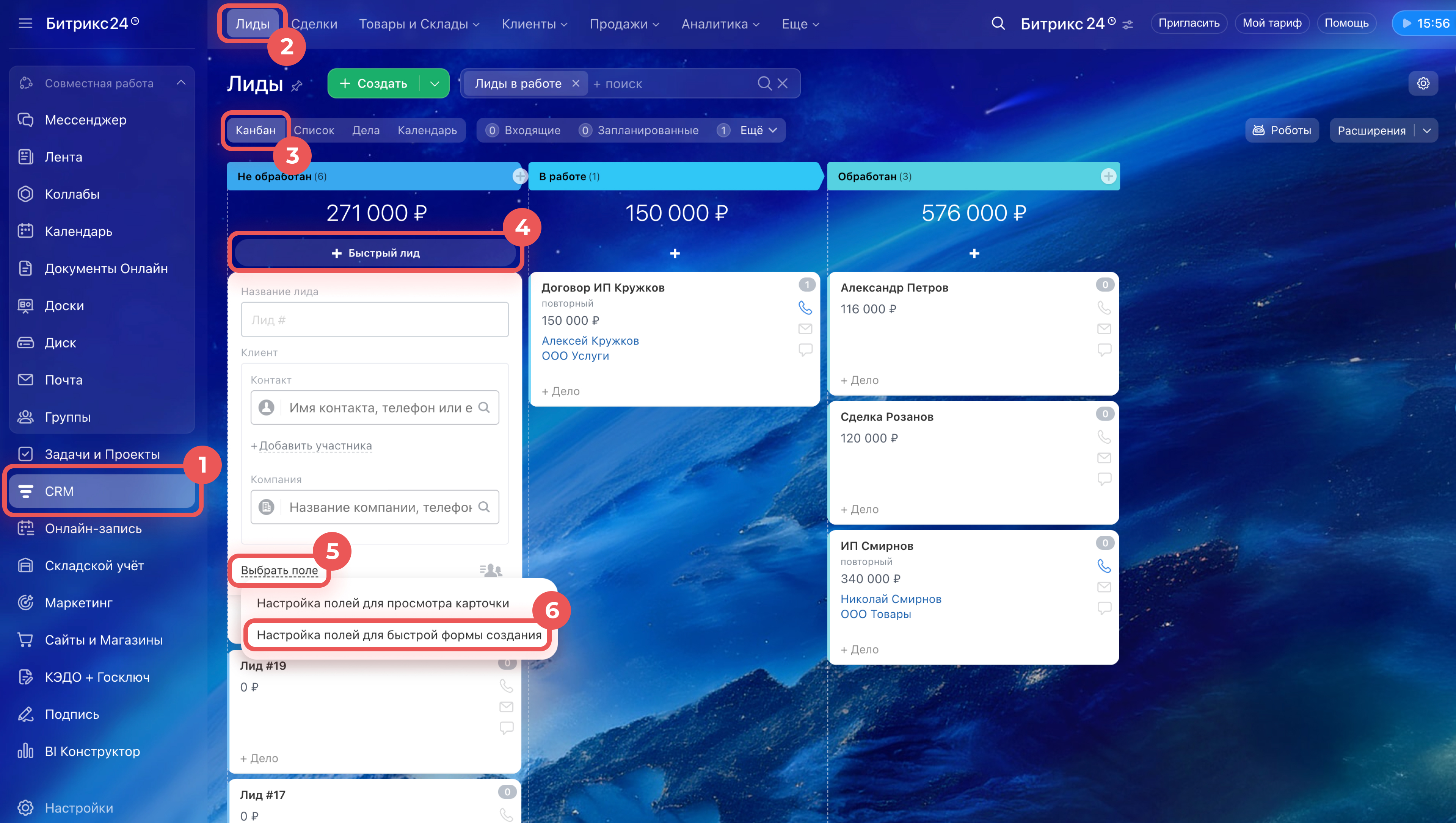 Рассмотрим настройку на примере быстрого лида, но те же шаги подойдут для любых элементов CRM, где доступен канбан.