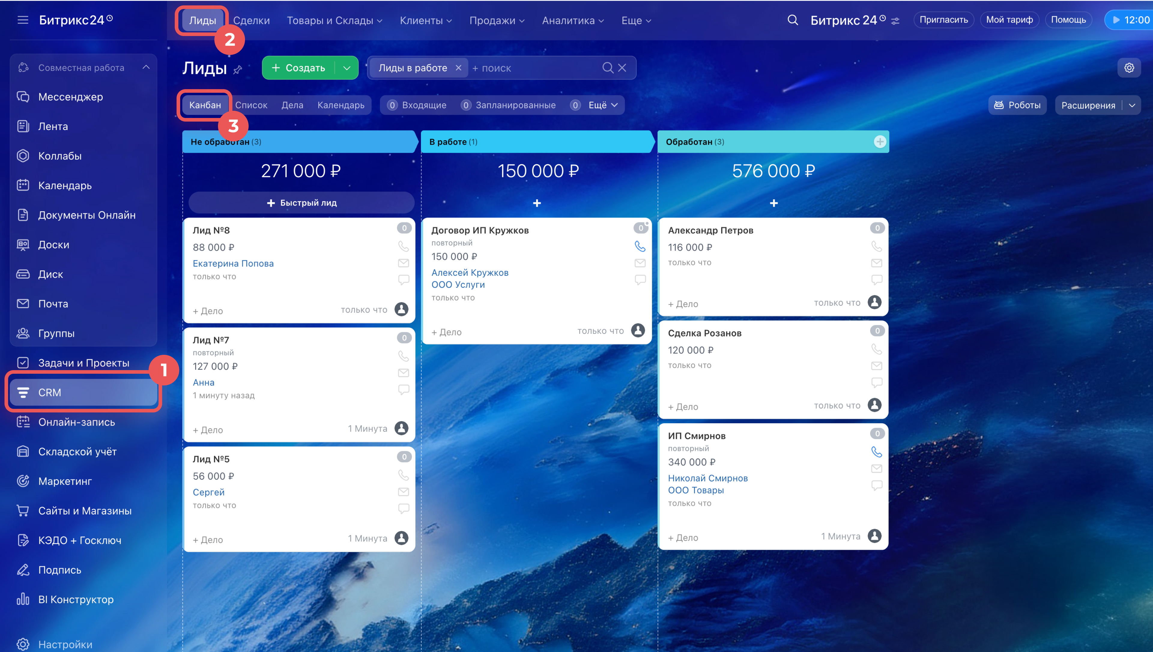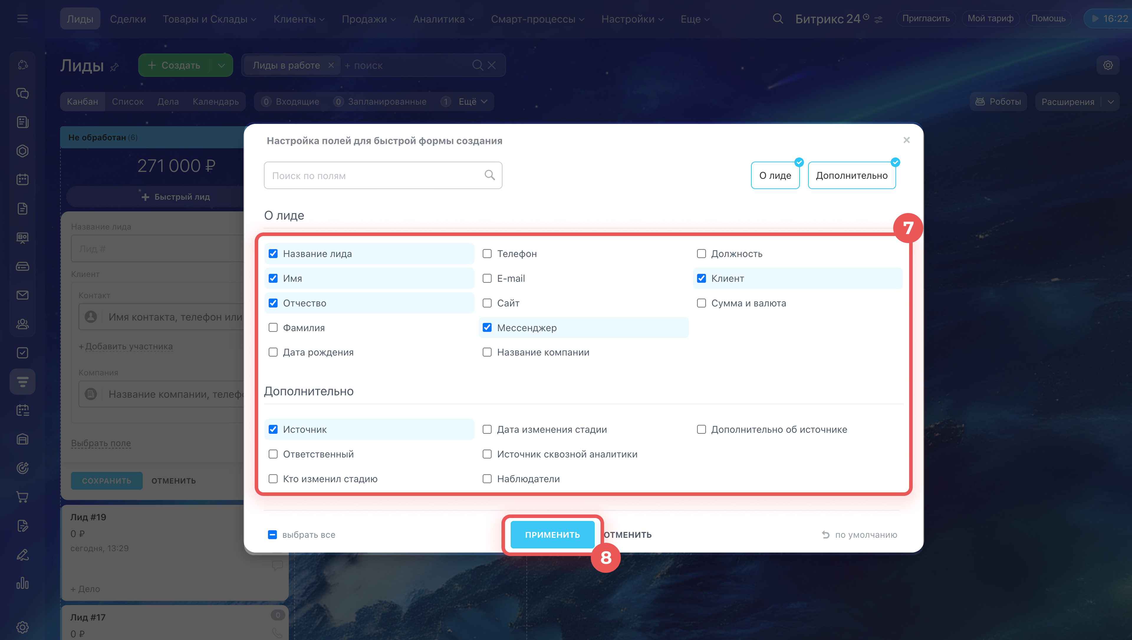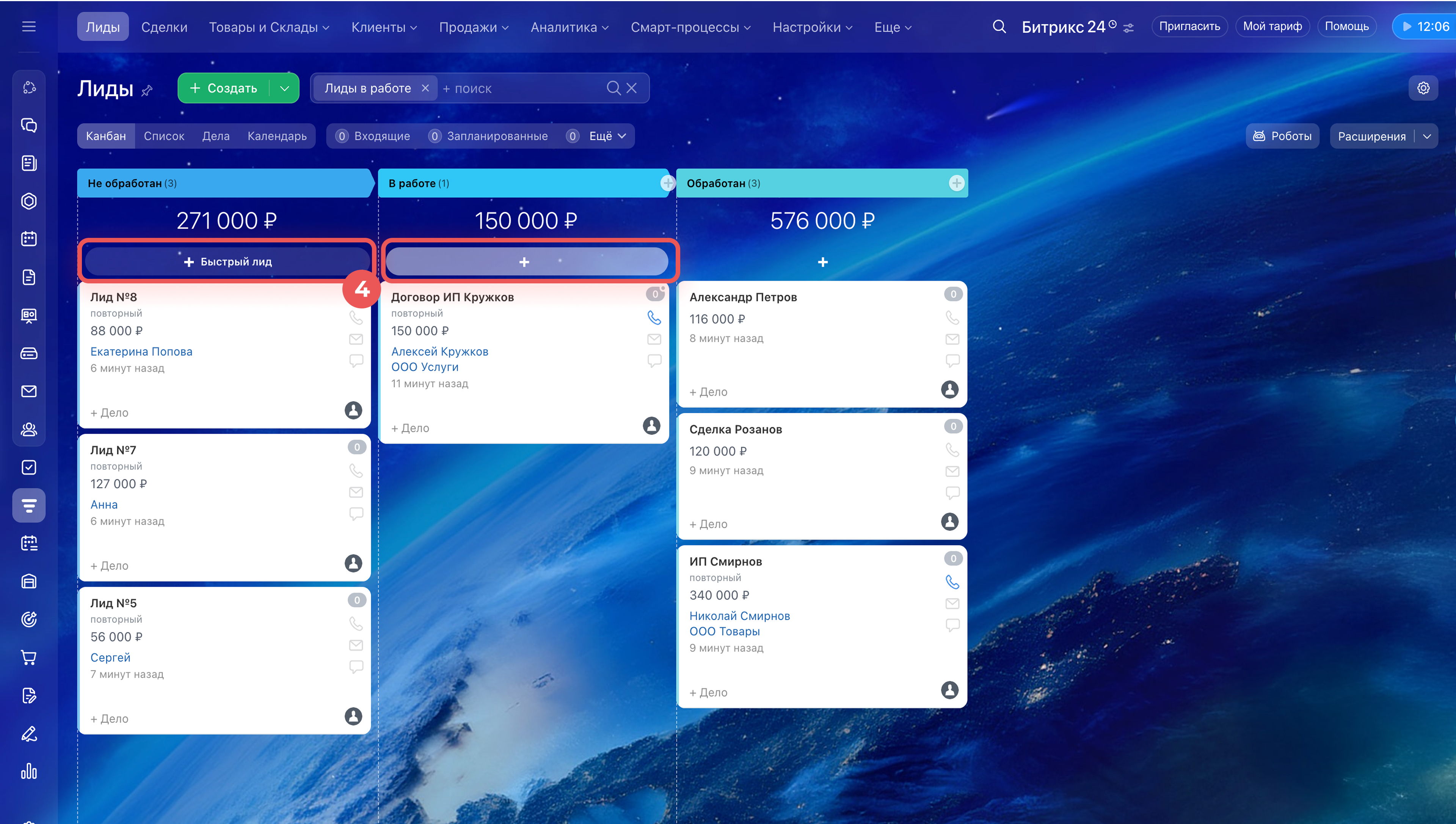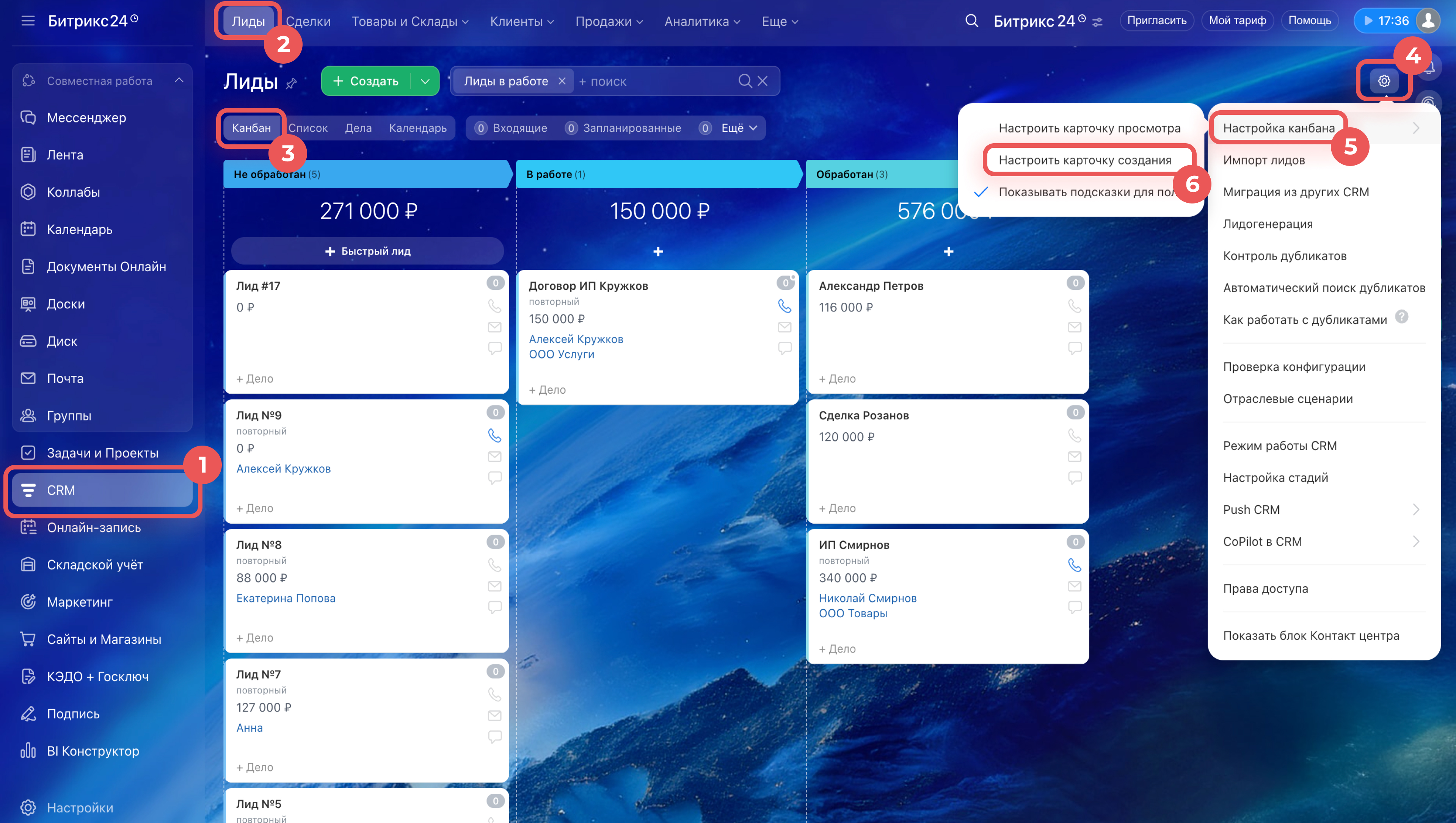 Рассмотрим настройку на примере быстрого лида, но те же шаги подойдут для любых элементов CRM, где доступен канбан.