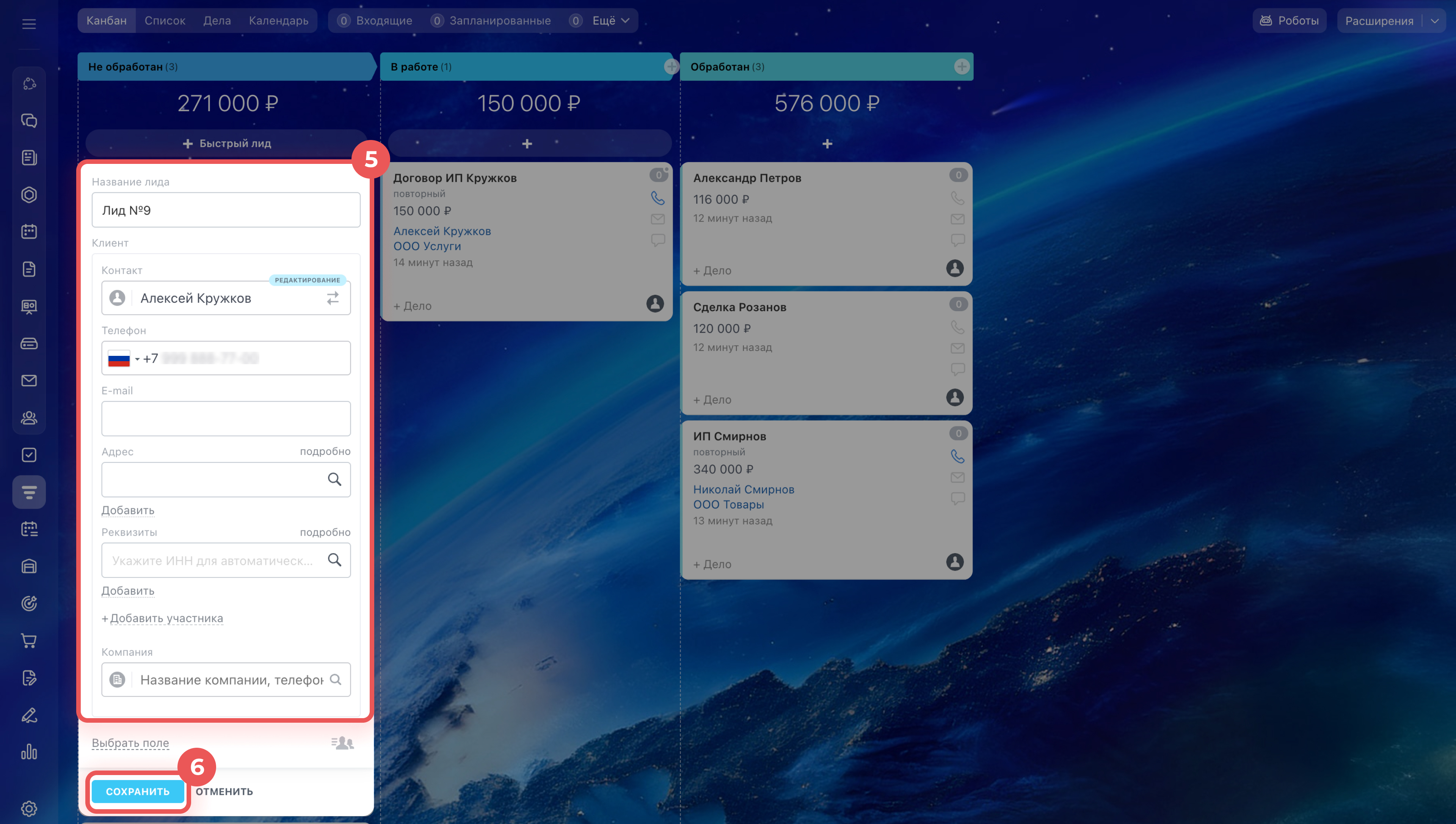 С помощью быстрой формы вы можете создать лид за несколько секунд. Это удобно, когда нужно зафиксировать обращение, не открывая полную карточку. Например, во время звонка менеджер вводит только имя и телефон — лид сразу появляется в канбане. Остальные данные можно добавить позже.