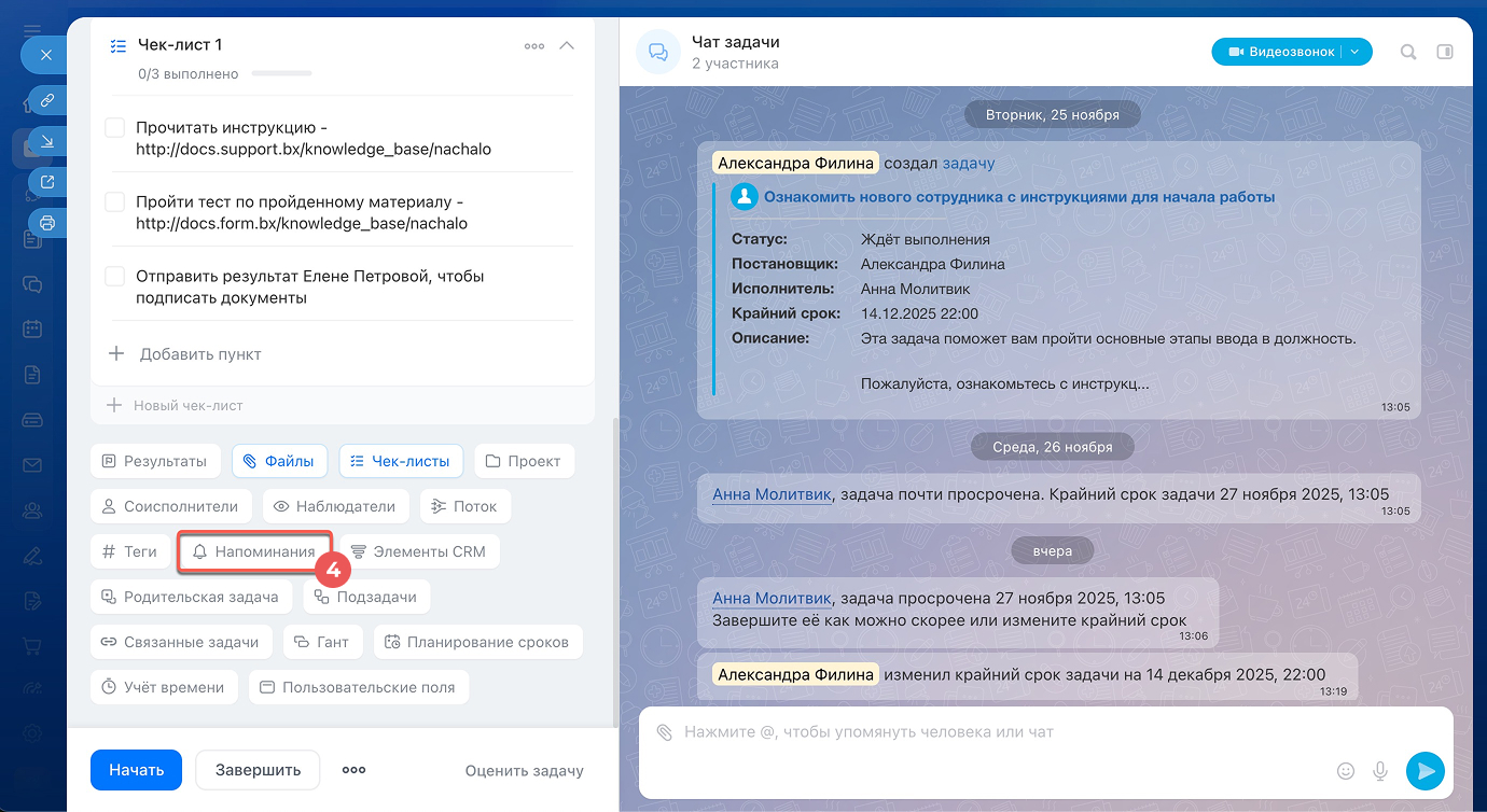 Напоминания в задачах Битрикс24 помогут не забыть о важных этапах работы. Они подскажут, когда начать выполнение, запросить информацию, посмотреть промежуточные итоги и закрыть задачу.