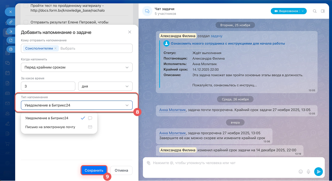 - Доступны уведомления в Битрикс24 или письма на электронную почту.