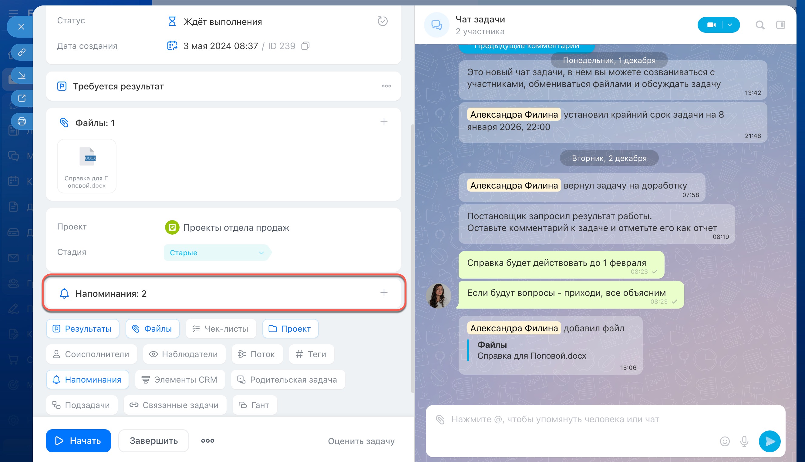 - Все настроенные сотрудником напоминания сохраняются в карточке задачи. Нажмите на блок Напоминания, чтобы развернуть список, изменить, удалить или добавить новое напоминание.