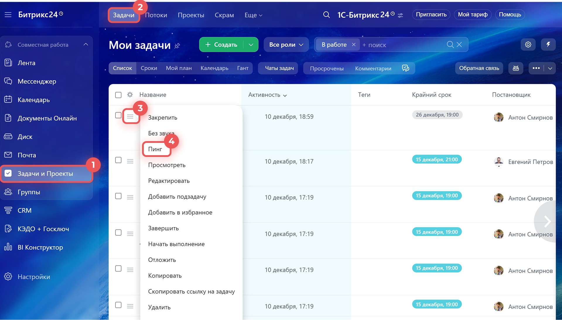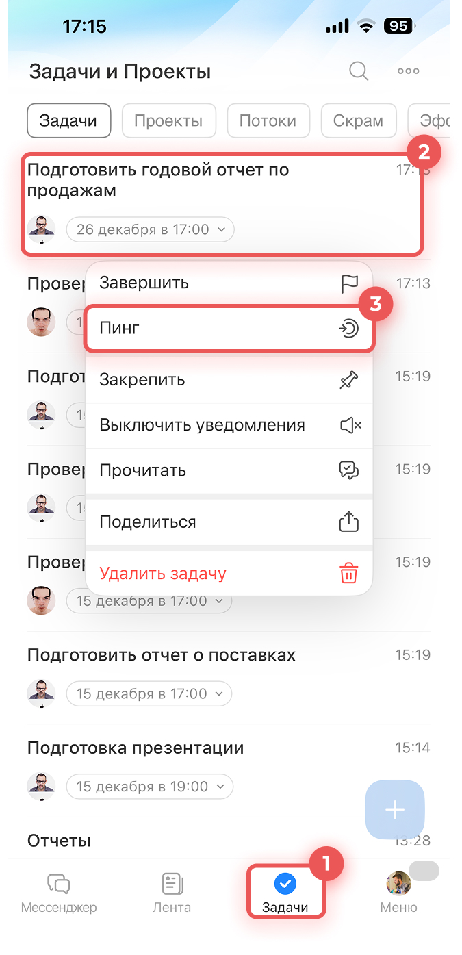 - Отправить пинг можно из списка задач: в веб-версии — через меню задачи, в мобильном приложении — долгим нажатием на задачу.