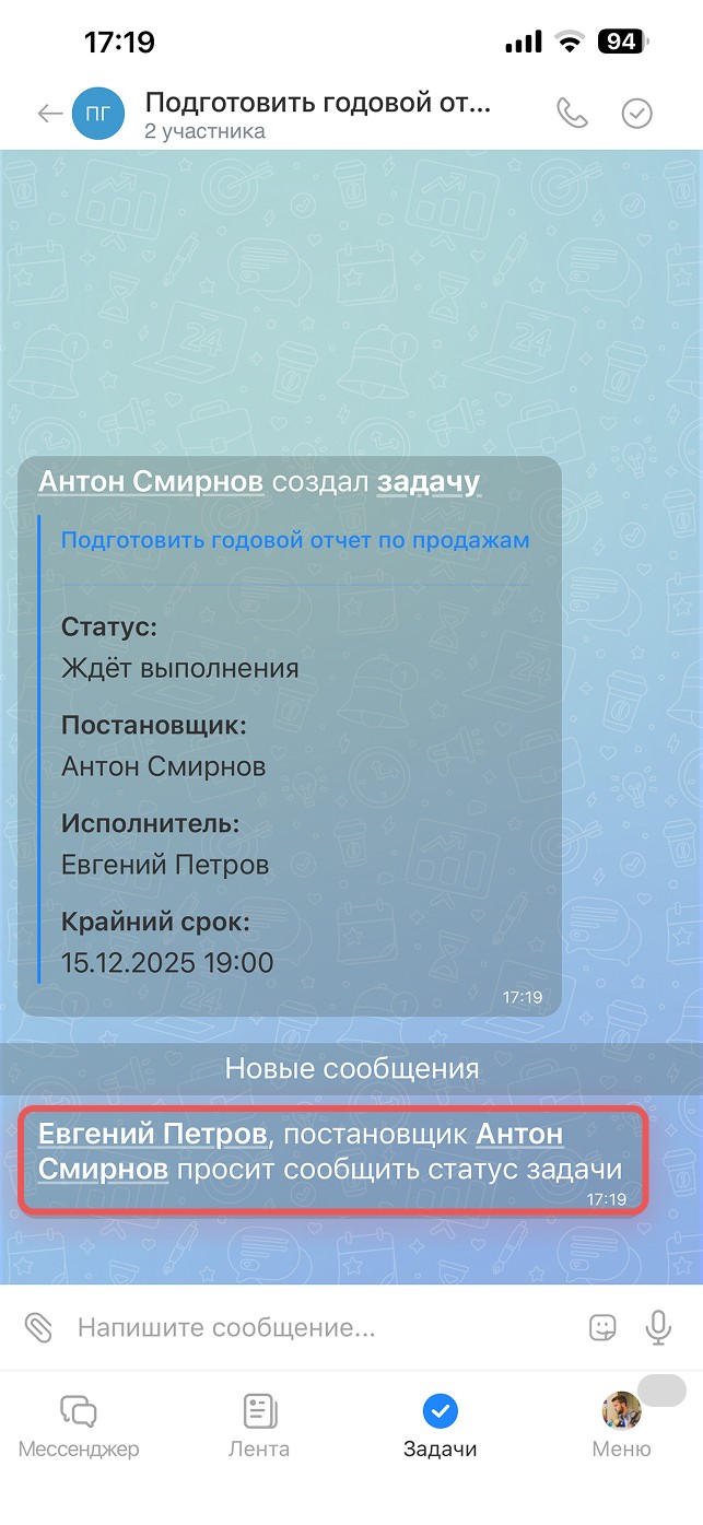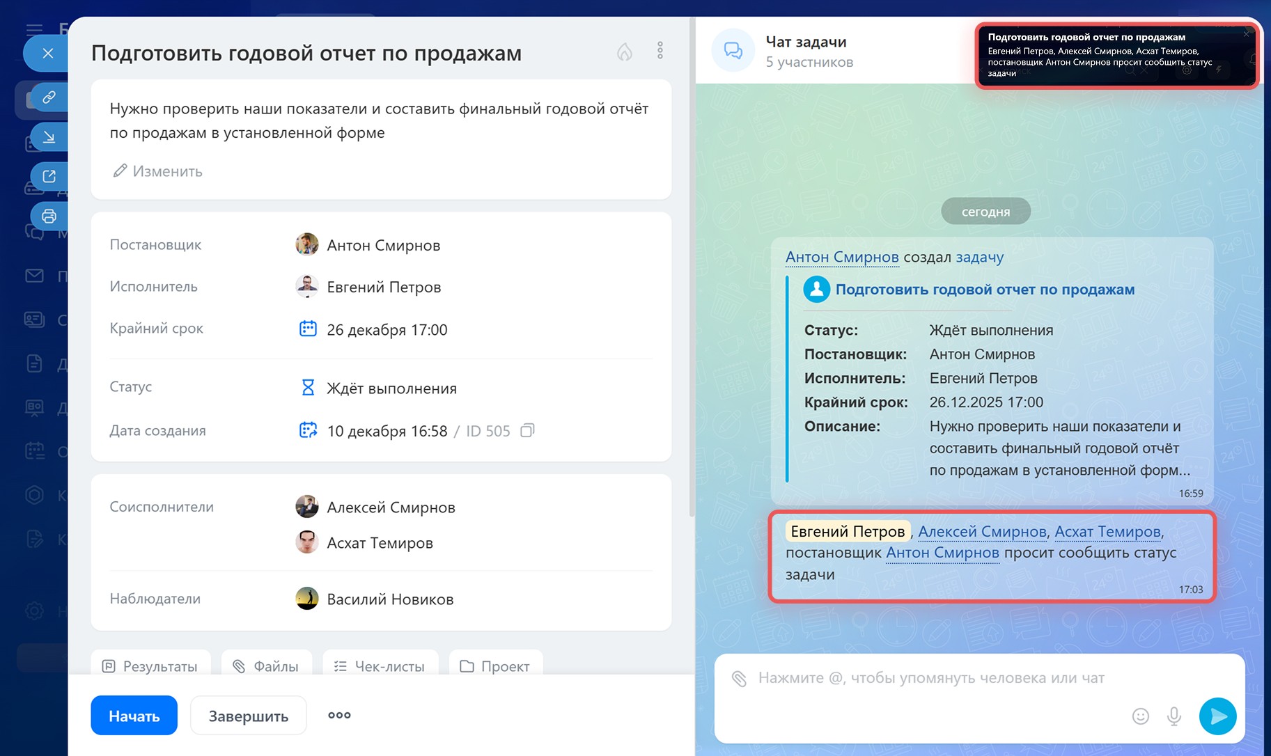 - Исполнитель и соисполнители получают уведомление о пинге и видят его как системное сообщение в чате задачи.
