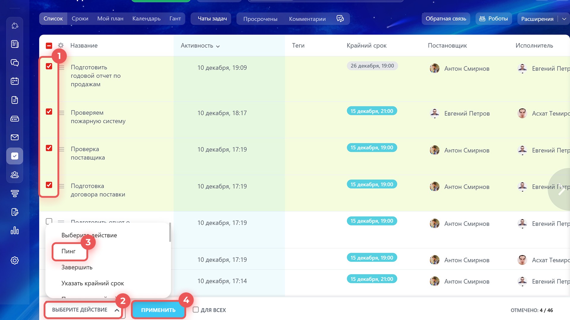Если задач несколько, можно запросить статус по ним с помощью групповых действий. В списке выделите нужные задачи и нажмите Выберите действие > Пинг > Применить.