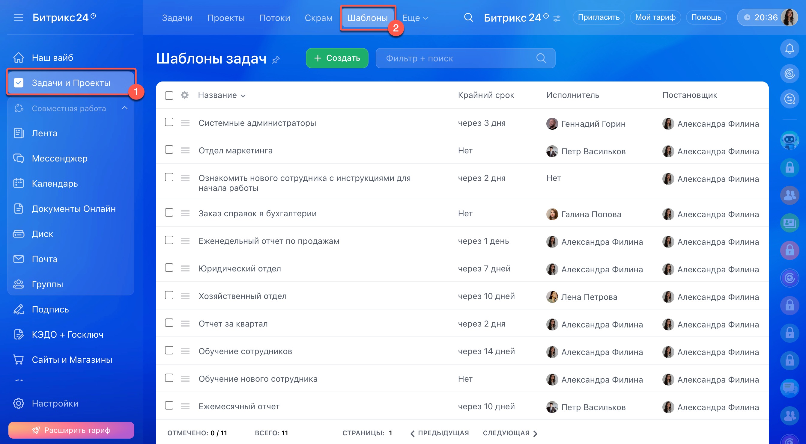 - Создать и просмотреть шаблоны можно в разделе Задачи и проекты > Шаблоны.