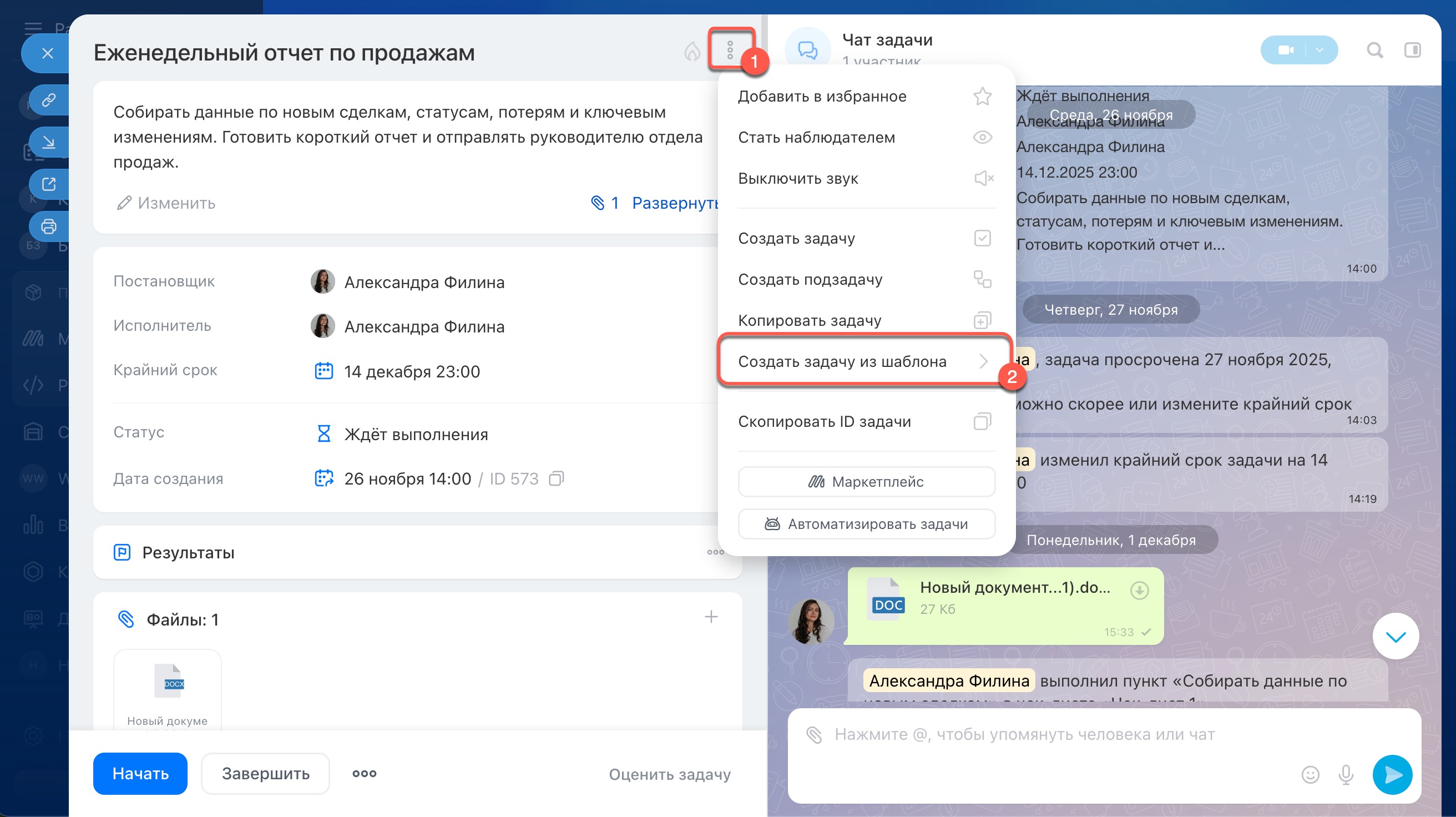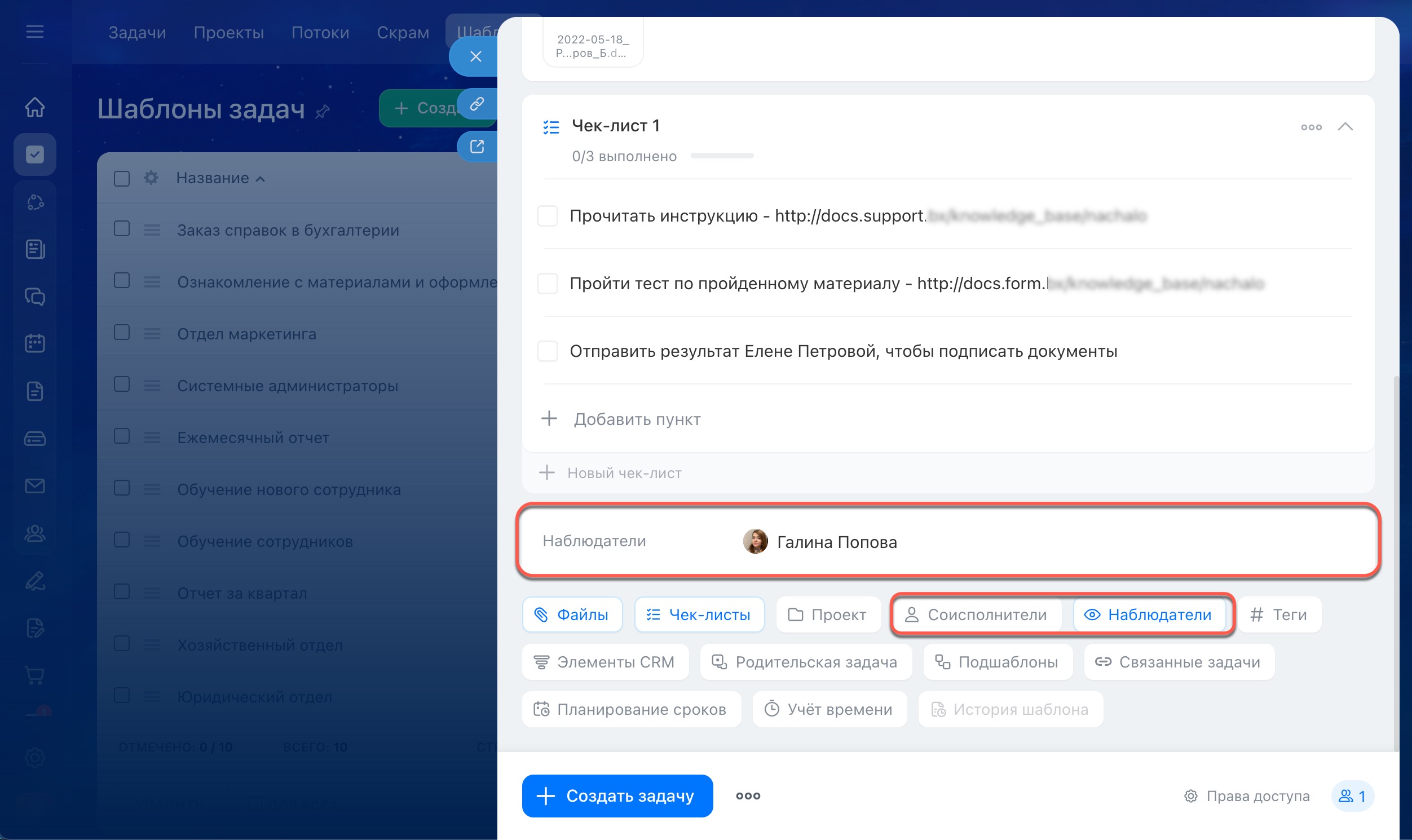 - Шаблоны задач помогают быстро создавать типовые поручения по готовому сценарию — с уже заданными ролями, сроками, чек-листом, файлами и другими настройками