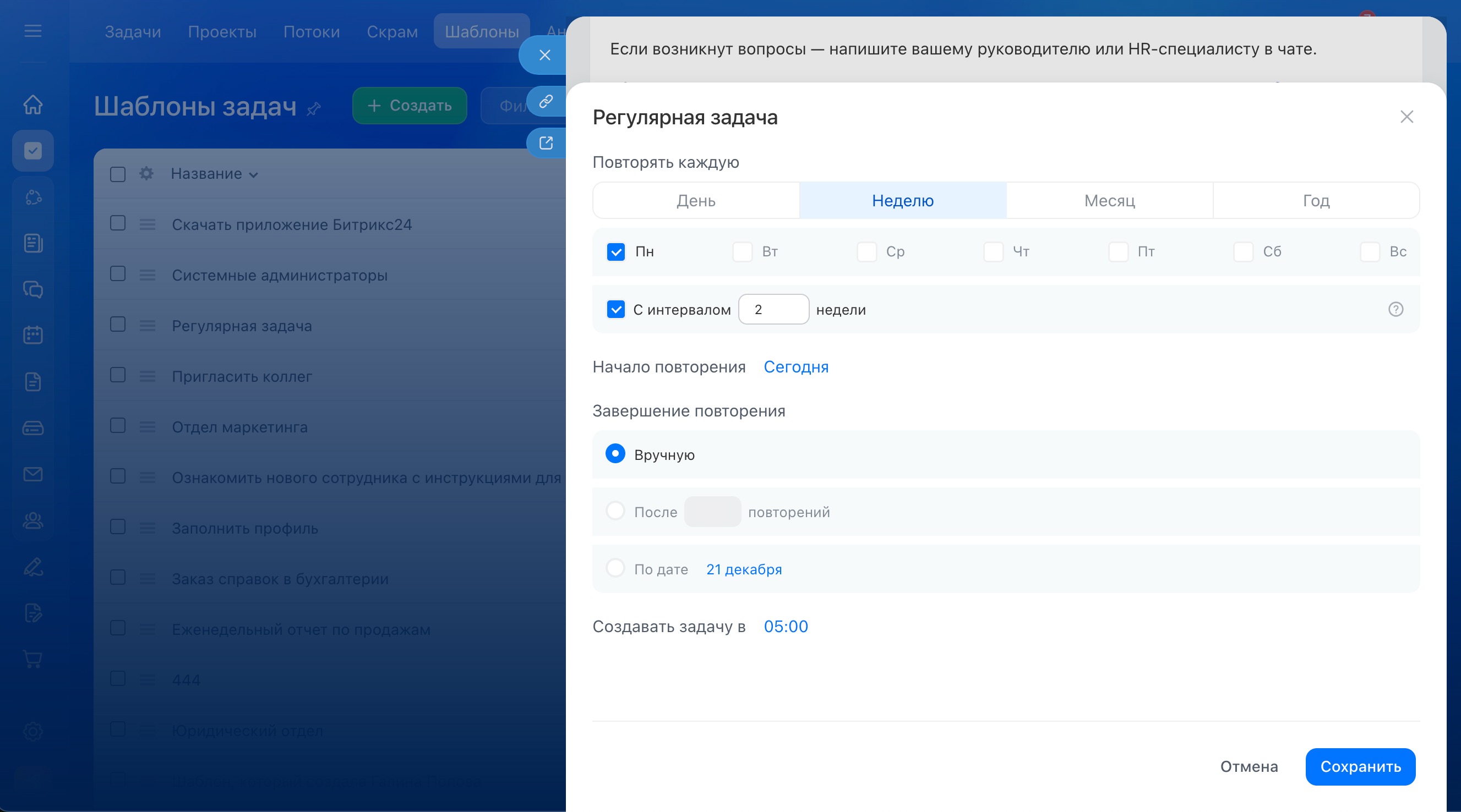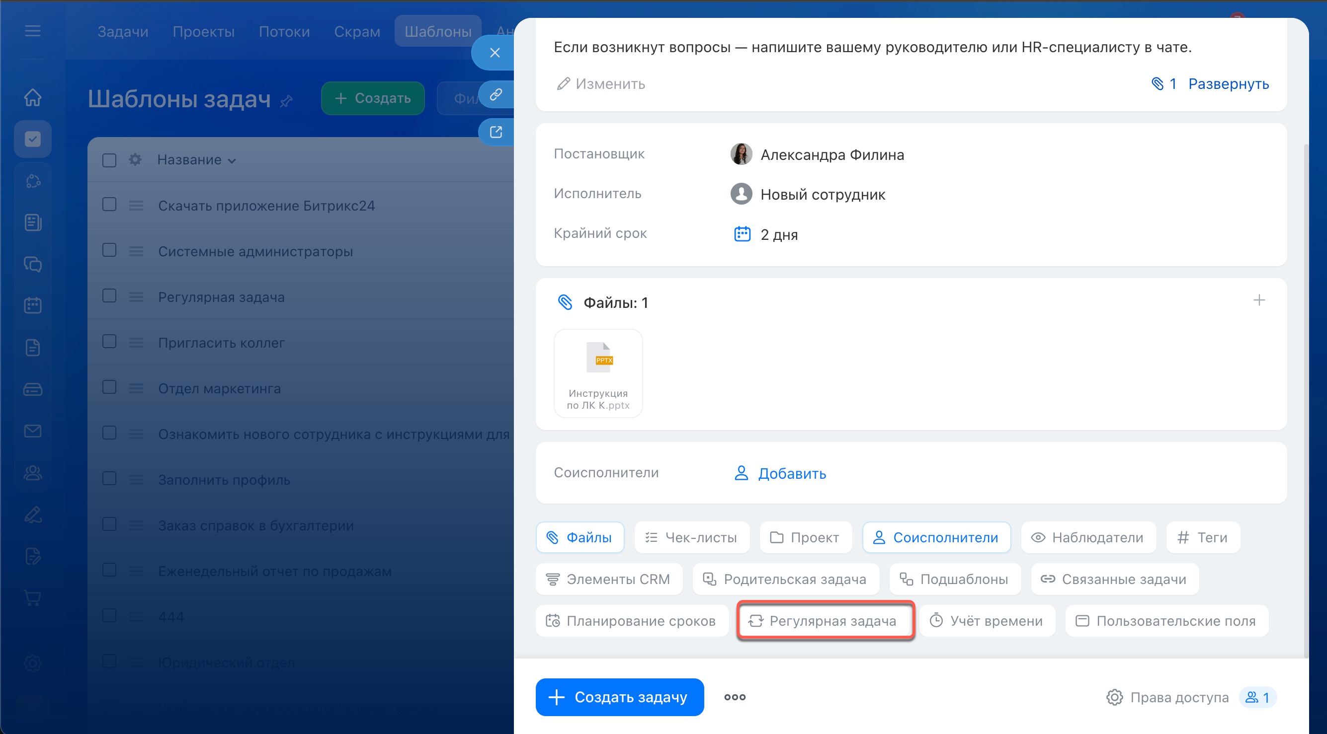 - Если задачи нужно повторять регулярно, настройте шаблон как регулярную задачу — Битрикс24 будет создавать ее автоматически по расписанию.