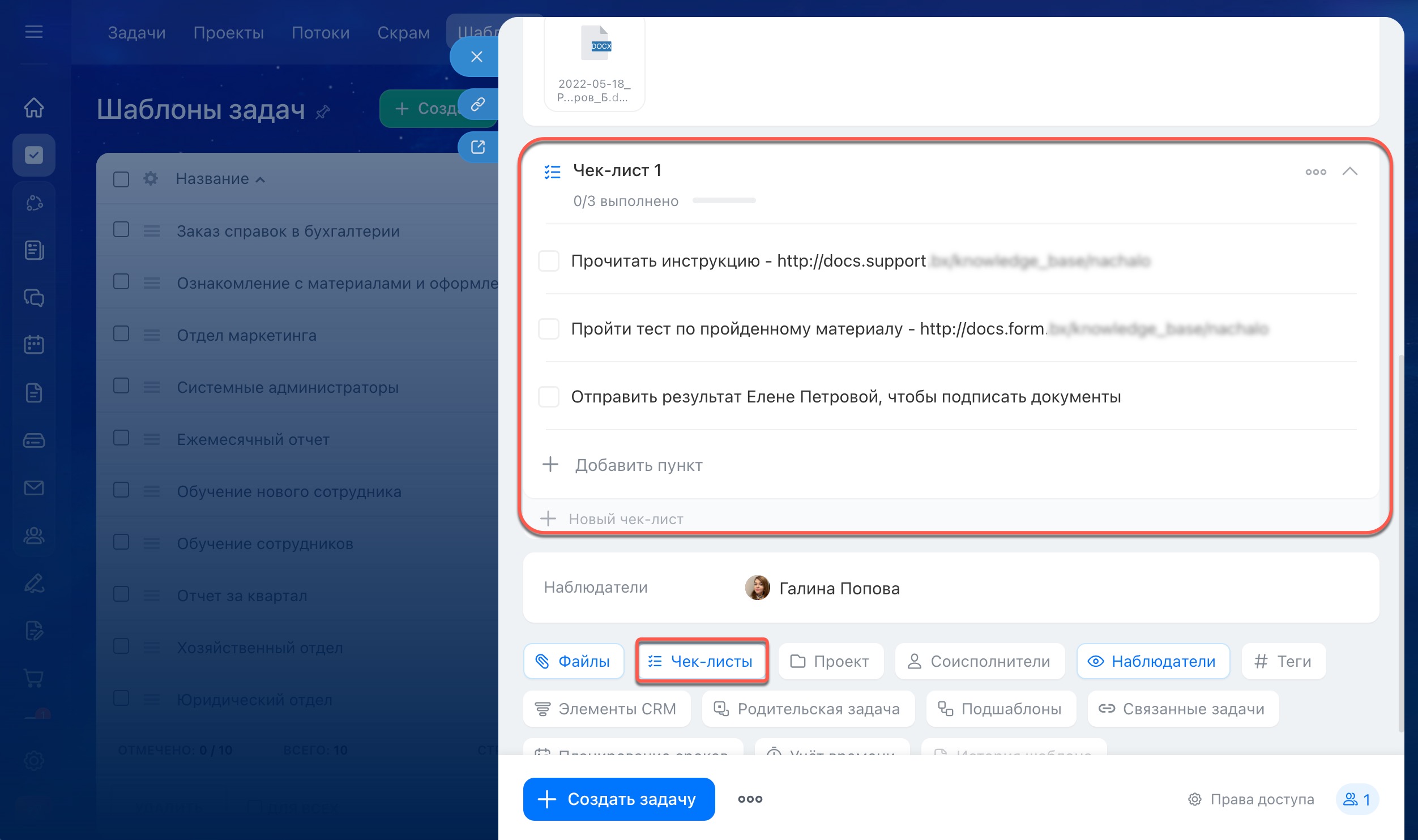Чек-лист — помогает структурировать шаблон задачи и распределять работу между участниками. Его используют, когда нужно выполнить несколько последовательных шагов или уточнить, кто отвечает за отдельные действия. Например, в шаблоне «Подготовить рекламную рассылку» в чек-листе можно отобразить этапы согласования материалов, а в задаче «Организовать мероприятие» — указать подпункты и отметить ответственных за каждый шаг.