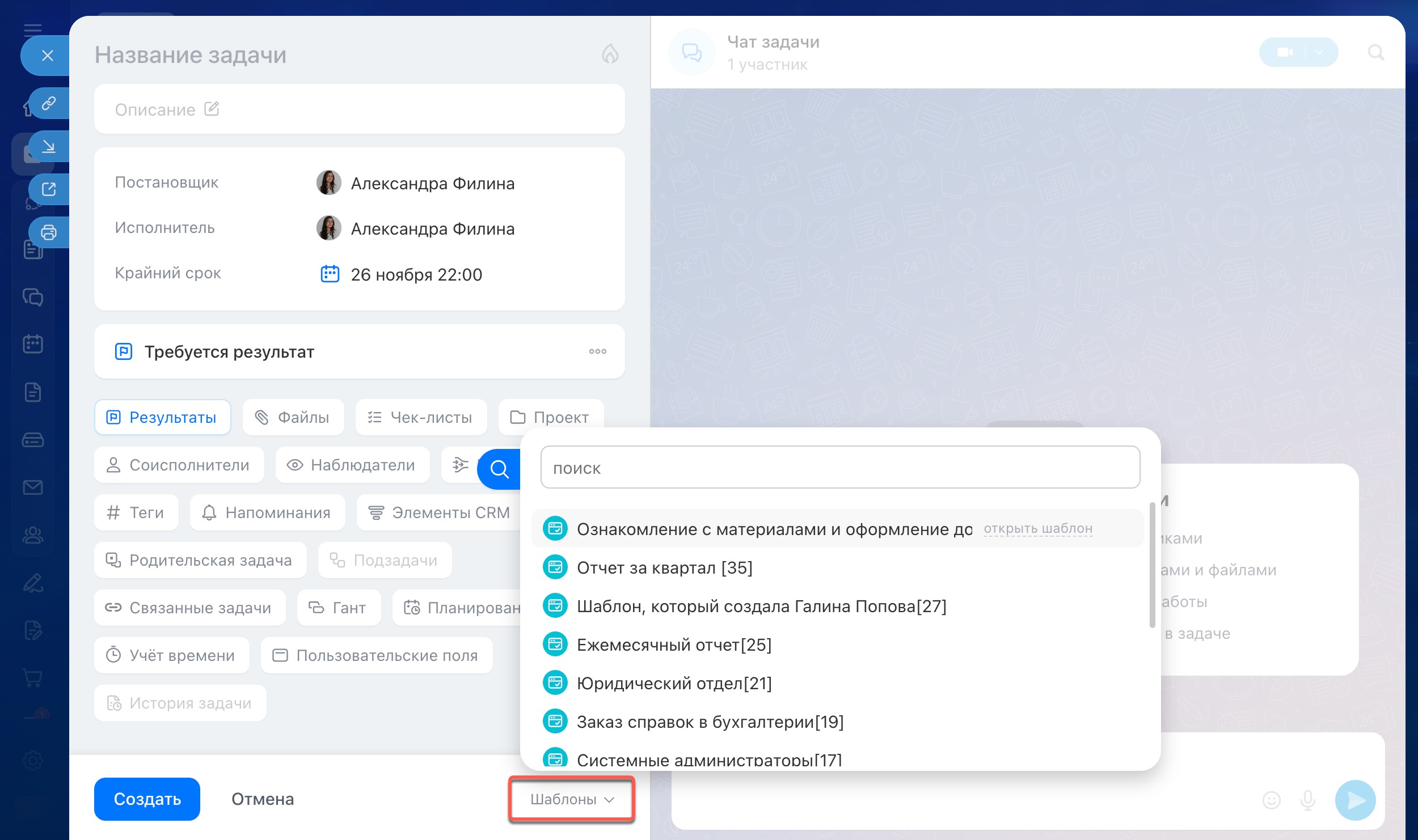 - При создании новой задачи — в карточке нажмите на блок Шаблоны и выберите нужный.