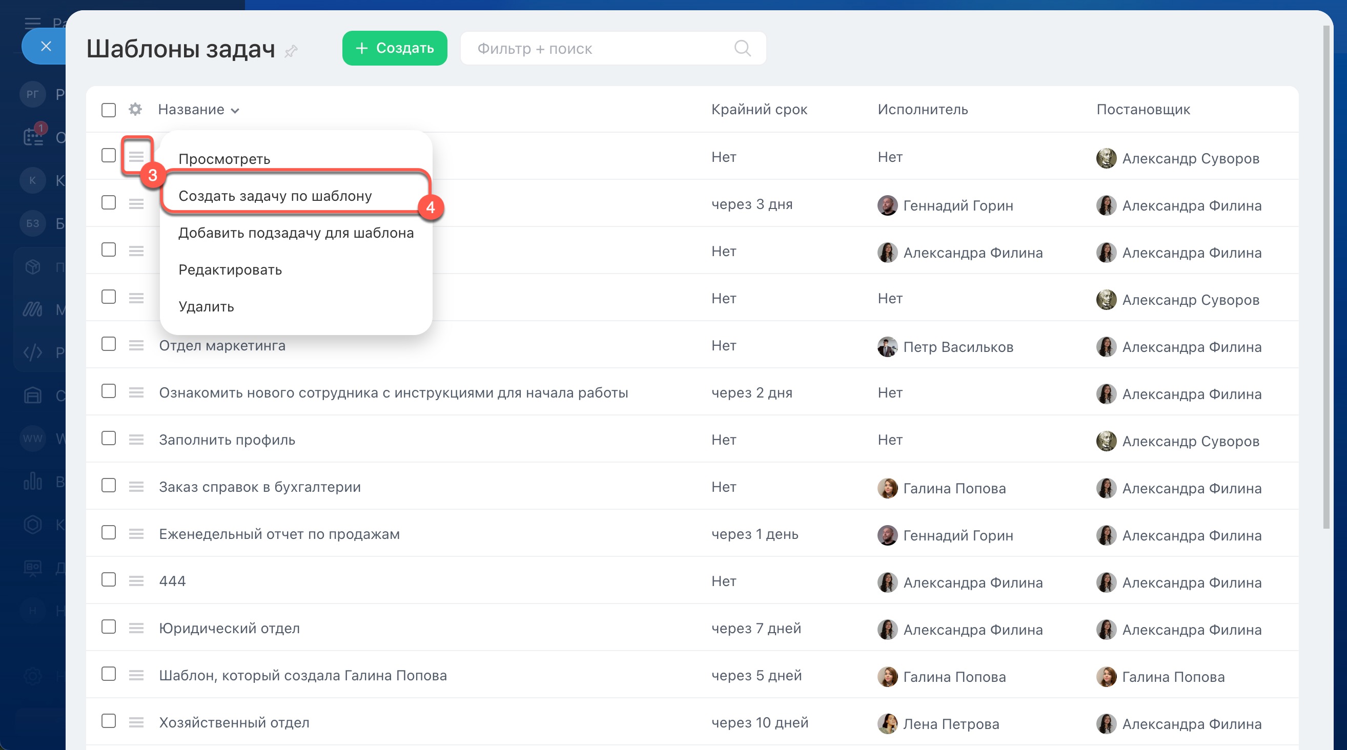 Исполнитель — укажите ответственного в шаблоне, чтобы задачи сразу назначались конкретному человеку. Если нужно, исполнителя всегда можно заменить перед постановкой задачи — шаблон не изменится.