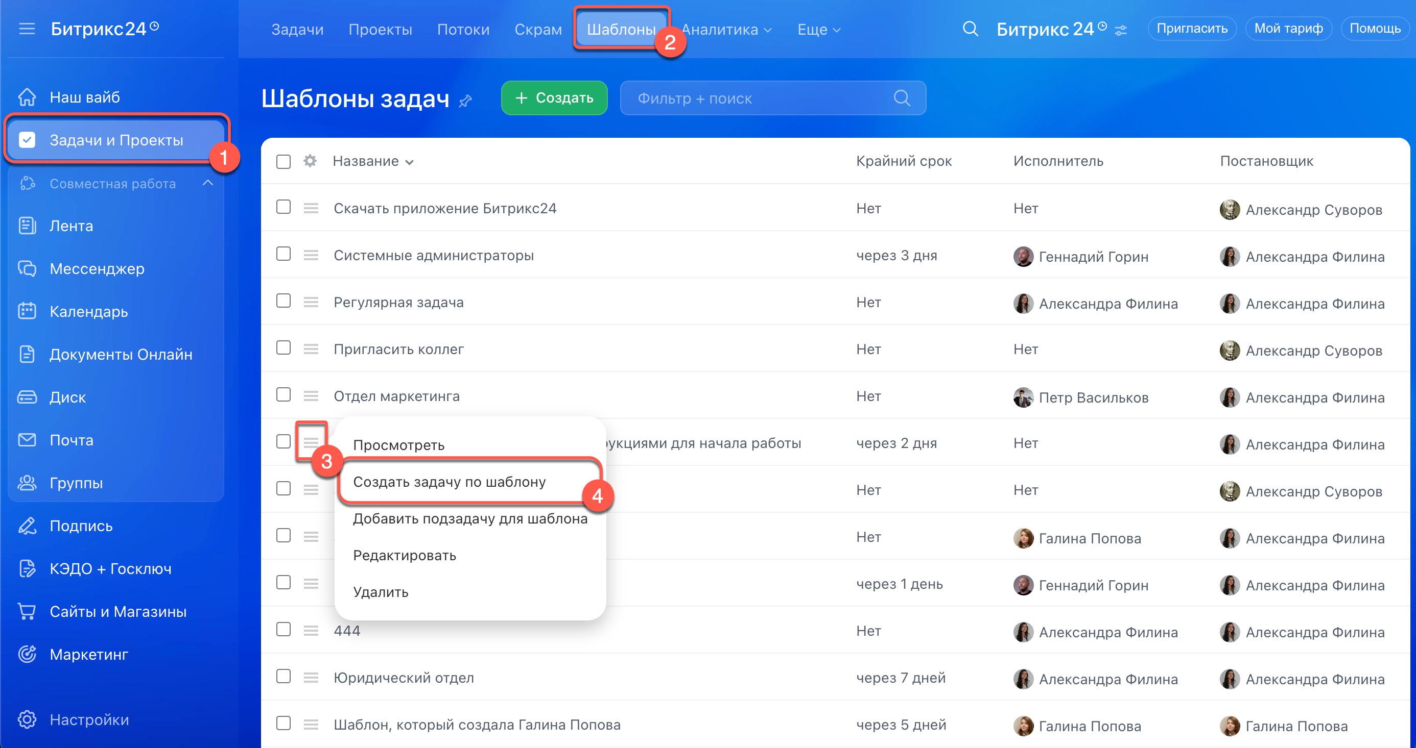 рядом с названием и выберите Создать задачу из шаблона. Рядом с нужным шаблоном нажмите Меню (≡) > Создать задачу по шаблону. В Битрикс24 появится новая задача. - В разделе Шаблоны — перейдите в Задачи и проекты > Шаблоны. Рядом с нужным шаблоном нажмите Меню (≡) > Создать задачу по шаблону.