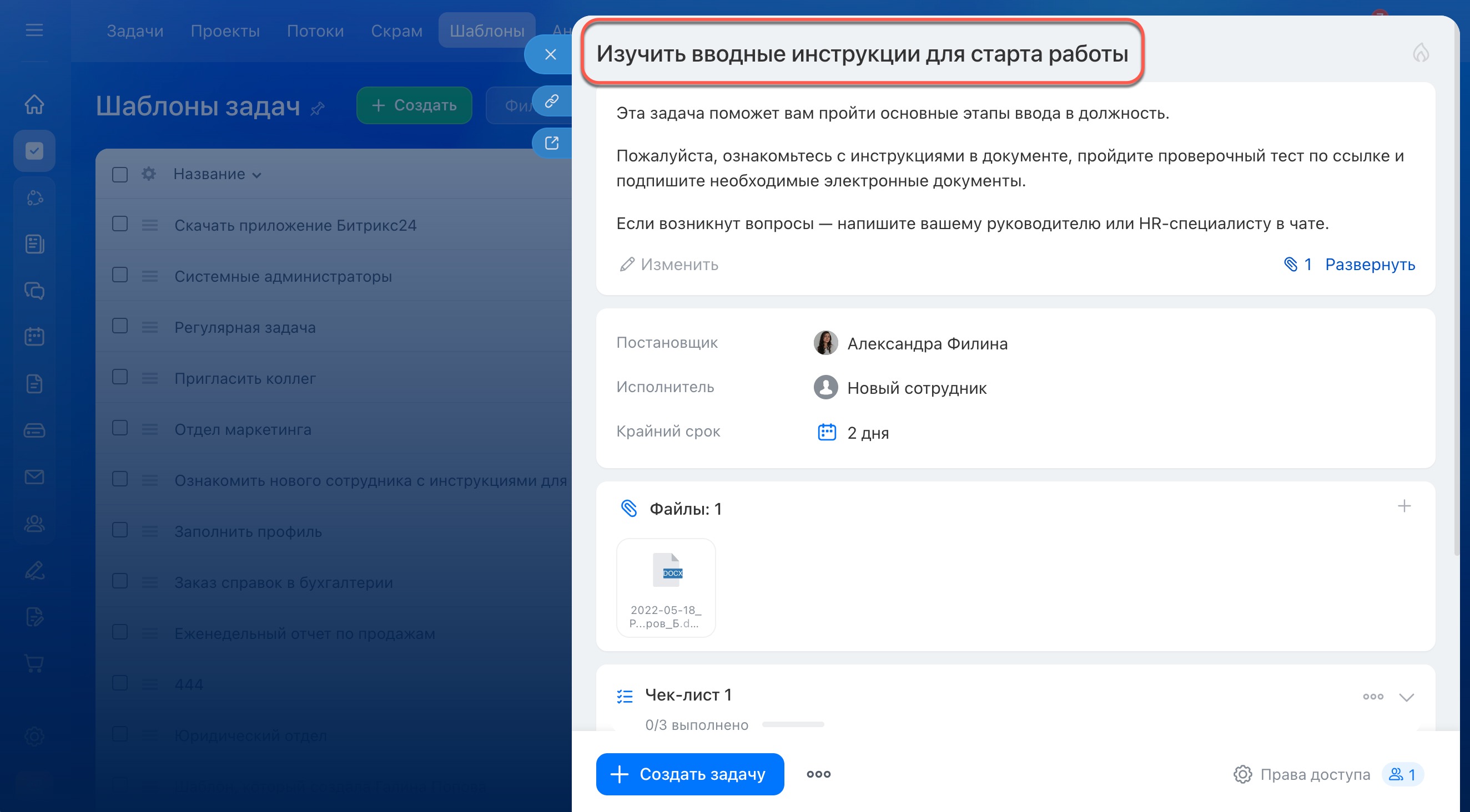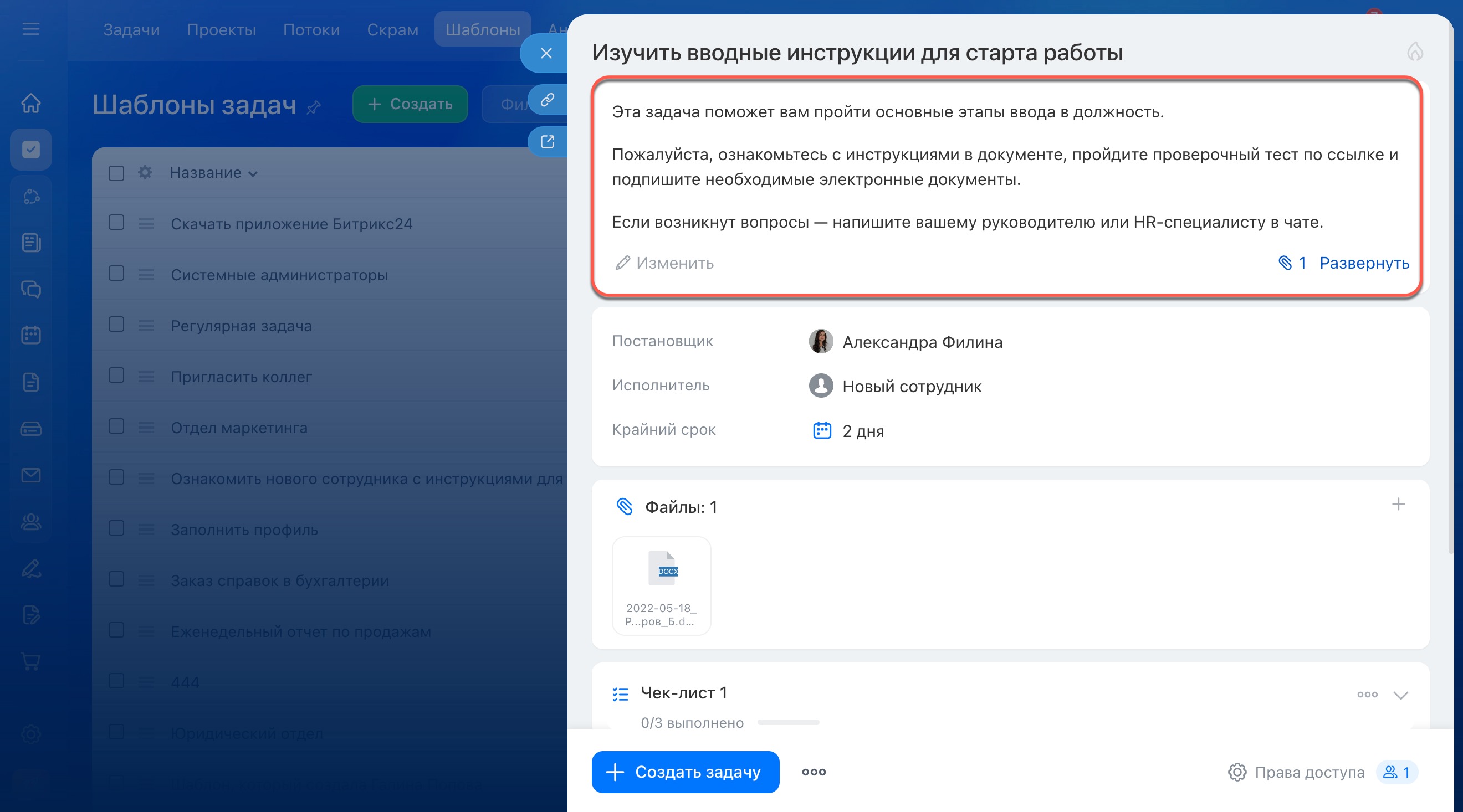 Например, в шаблоне «Изучить вводные инструкции для старта работы» можно описать общий план: какие разделы базы знаний нужно изучить, какие тесты предстоит пройти. В самой задаче руководитель добавит актуальные ссылки на документы и задания.
