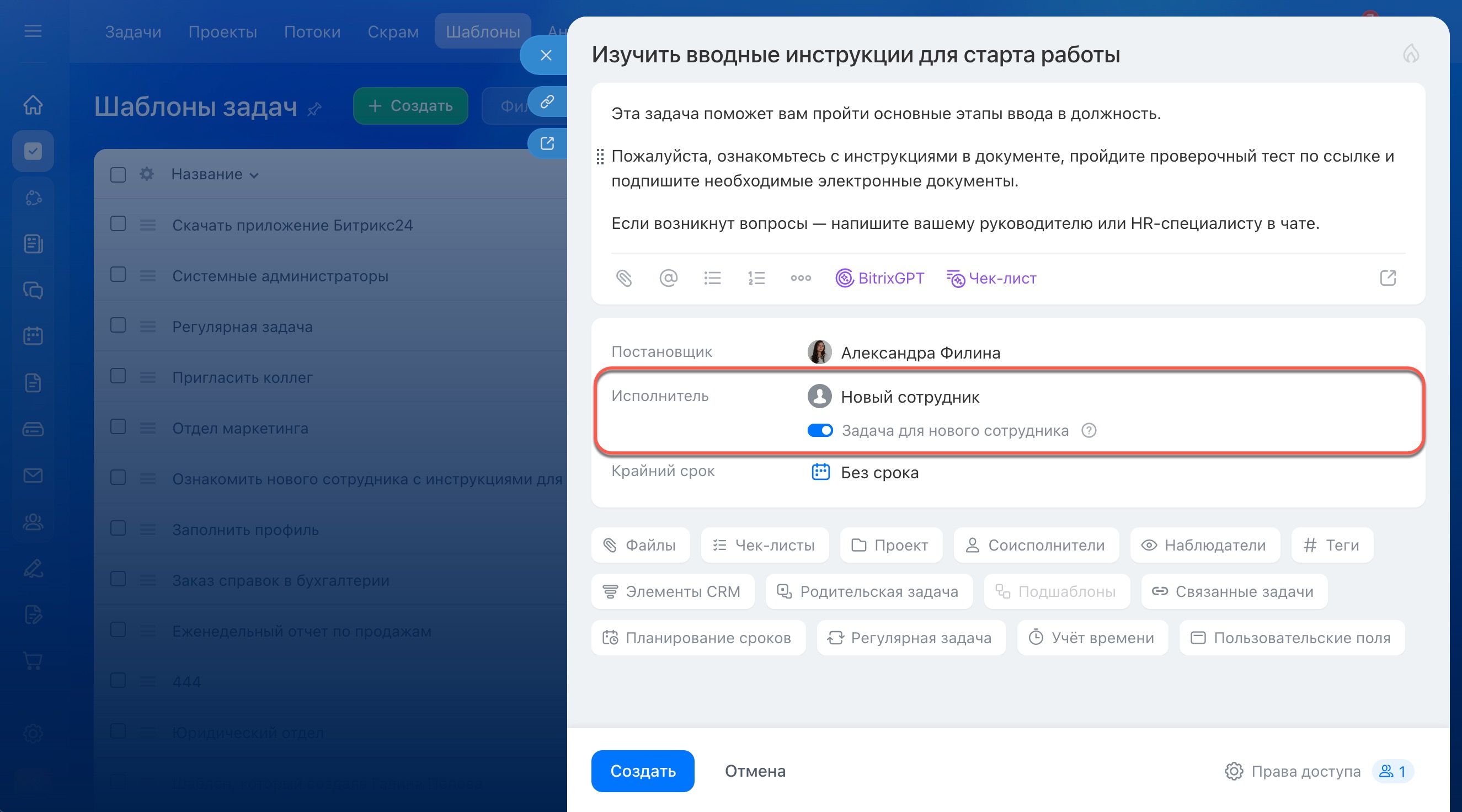 Опцию «Задача для нового сотрудника» можно использовать в шаблонах, которые связаны с адаптацией или вводом в должность. Она позволяет автоматически создавать задачи для каждого нового сотрудника — без ручной постановки.