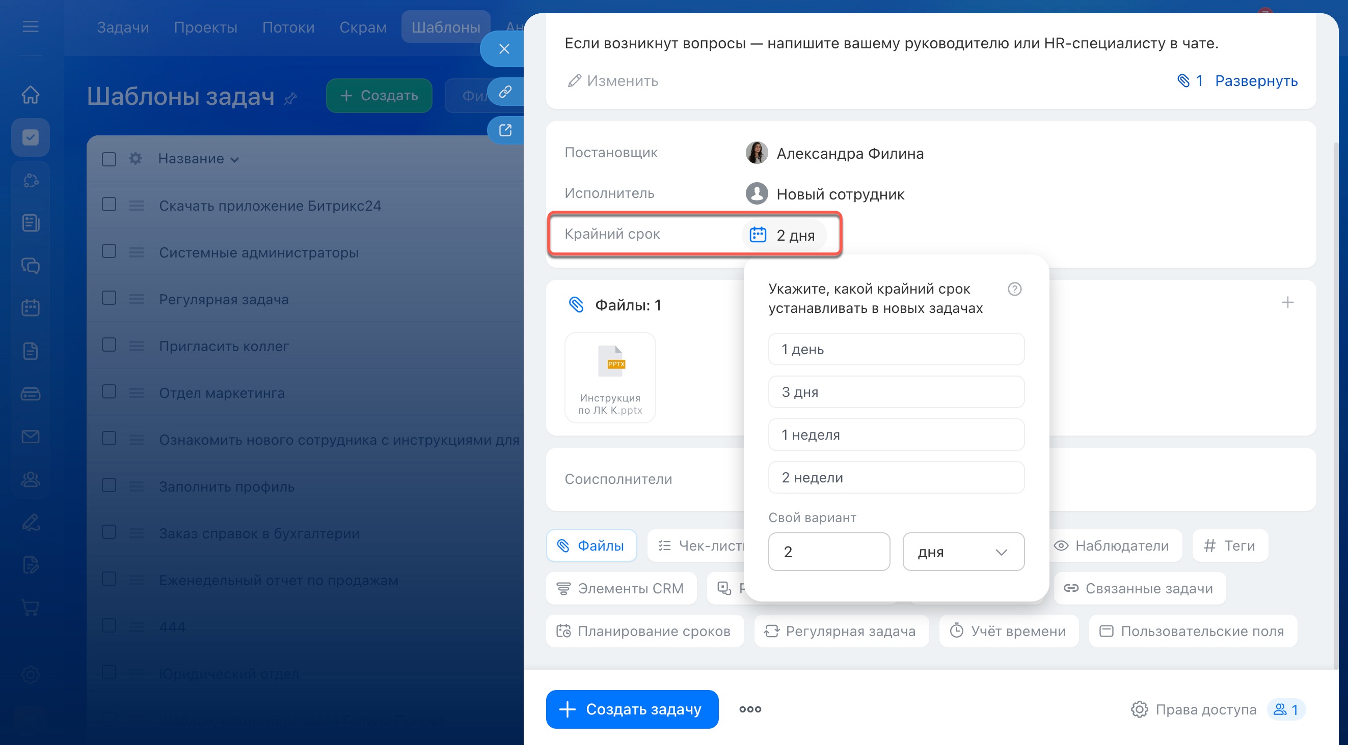 Срок выполнения — укажите, через какое время после создания задача должна быть завершена. Это помогает планировать нагрузку и укладываться в сроки. Например, для шаблона «Ознакомить нового сотрудника с инструкциями» срок выполнения — через 2 дня после создания. Для шаблона «Подготовить договор для клиента» — срок 3 дня, чтобы согласовать материалы с юристами и руководителем.
