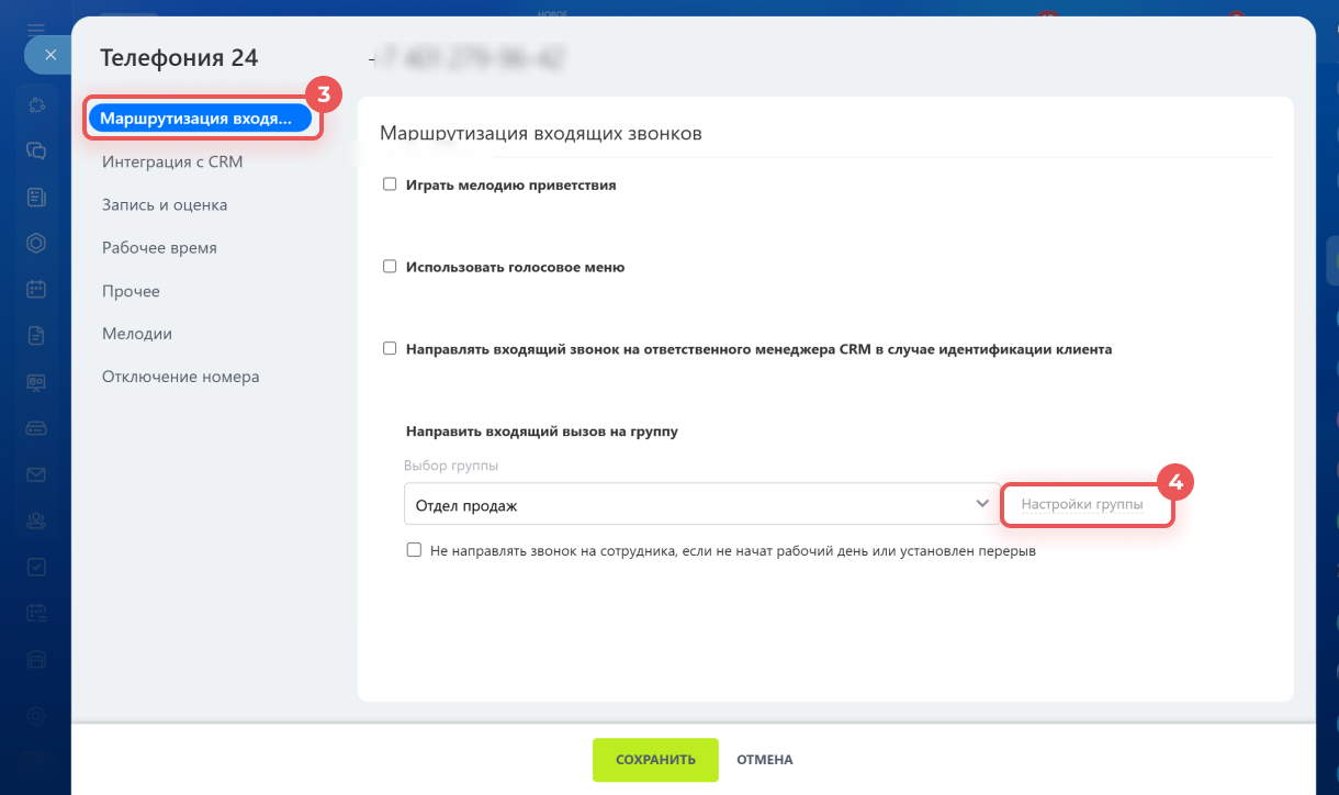 Звонок из CRM-формы обратного звонка приходит сотрудникам, указанным в настройках номера на вкладке Телефония > Настройка номеров > Маршрутизация входящих звонков > Настройки группы, а не ответственному за форму.