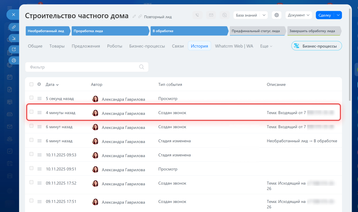 Чтобы узнать дату и время разговора, откройте историю карточки CRM — там будет событие «Создан звонок» с верным временем.