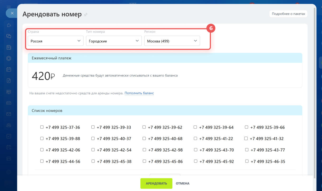 Аренда номера. Стоимость аренды номеров вы можете узнать в разделе CRM > Клиенты > Контакт-центр > Телефония > Аренда номера. Чтобы посмотреть цену, выберите нужную страну, регион и тип номера.