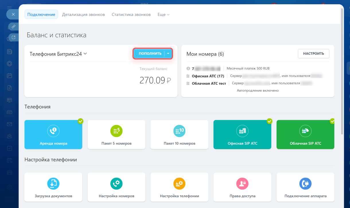 При подключении телефонии через SIP-коннектор за звонки вы платите оператору АТС. Баланс в Битрикс24 пополнять не нужно.