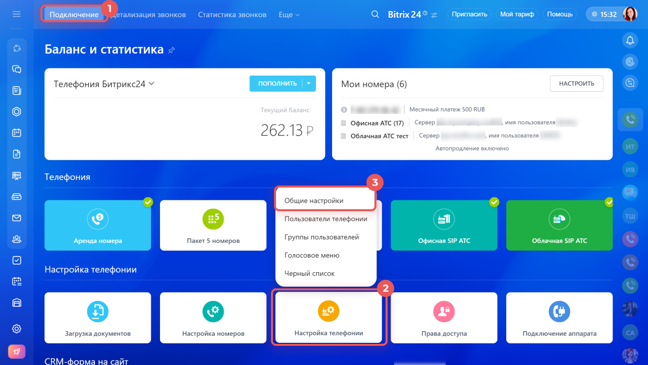 1–3. В разделе Телефония перейдите на вкладку Подключение > Настройки телефонии > Общие настройки.