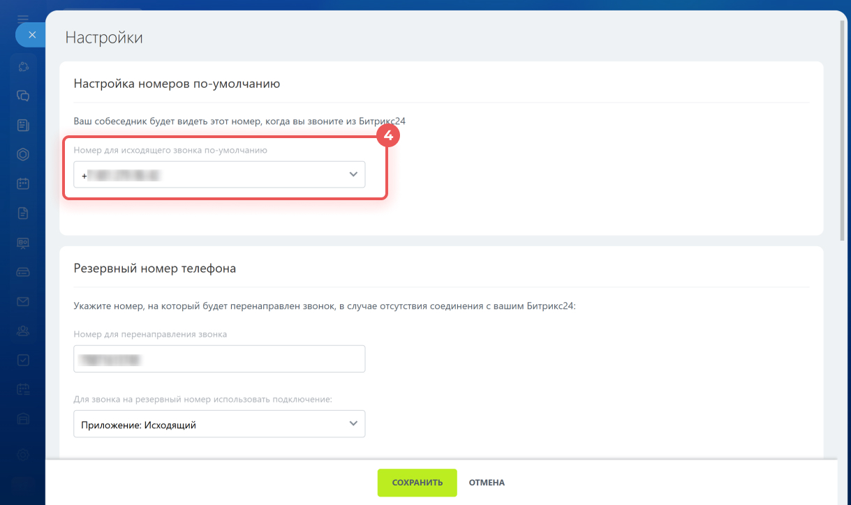 4. В разделе Настройка номеров по умолчанию выберите номер для исходящего звонка.
