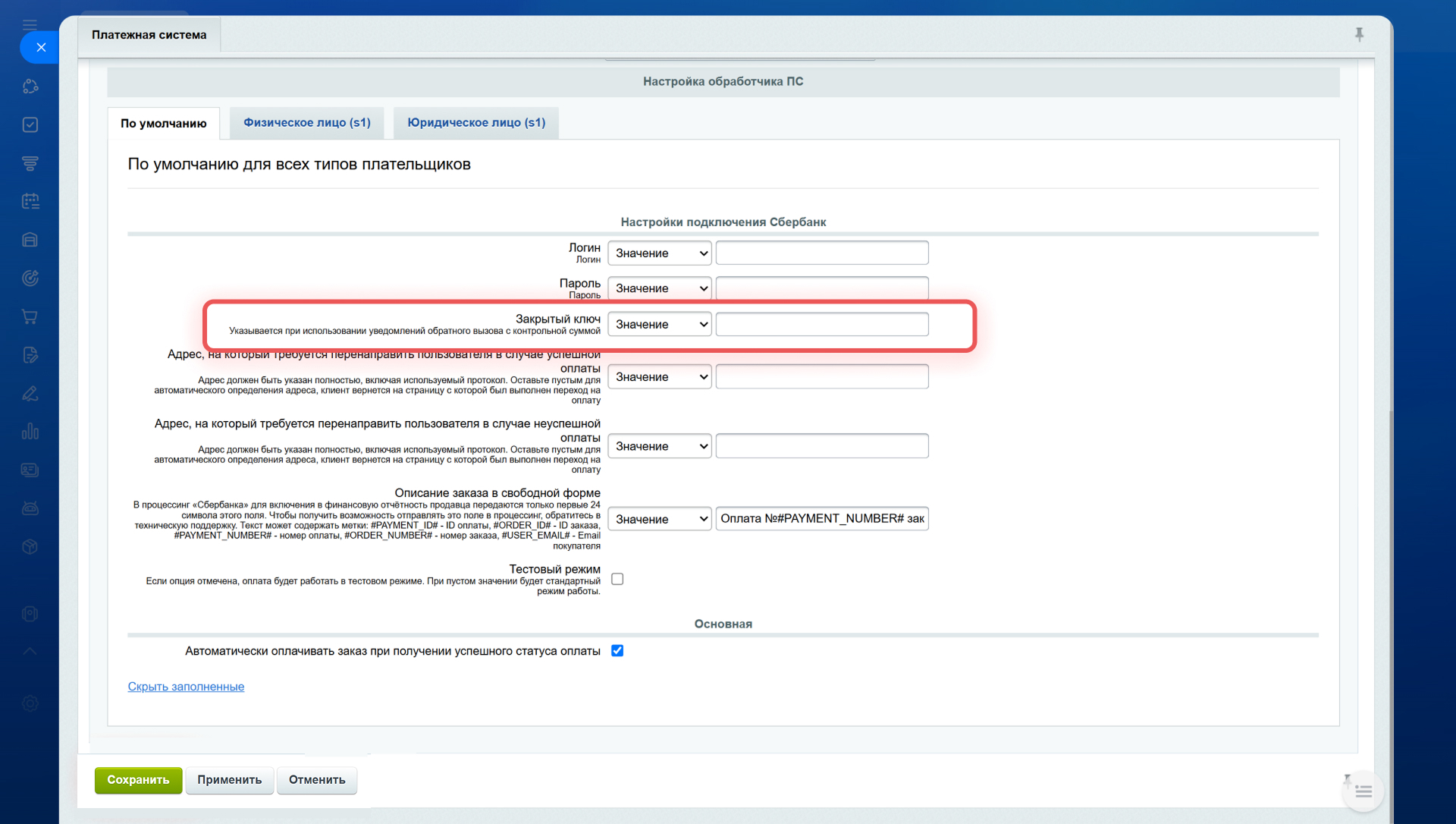В кабинете Сбербанка укажите адрес для уведомлений: https://ваш_битрикс24/bitrix/tools/sale_ps_result.php. Проверьте, что тип подписи и шифрование соответствуют требованиям банка. Обычно нужен вариант с симметричным шифрованием. Сгенерируйте токен и укажите его в настройках платежной системы в поле Закрытый ключ.