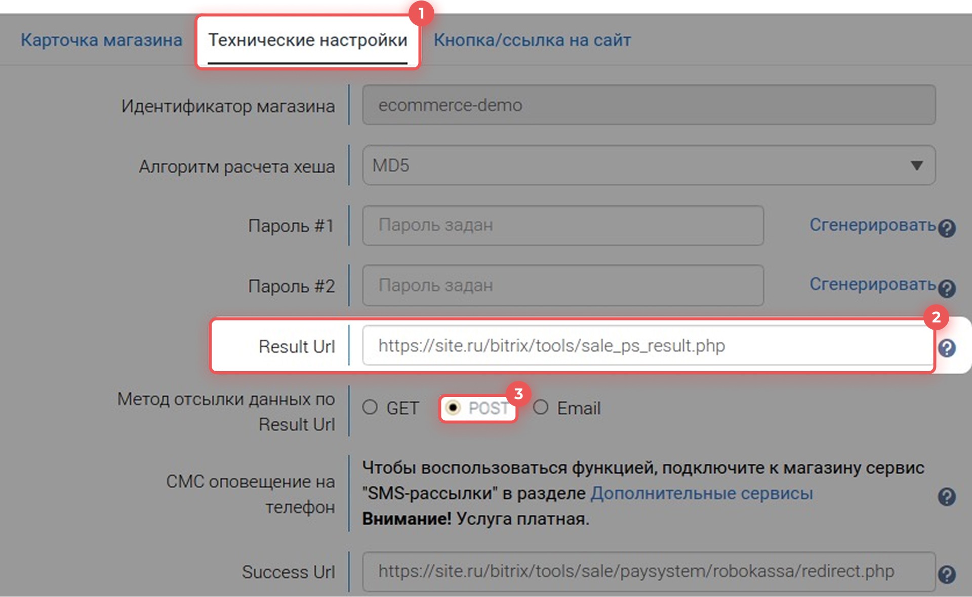 Robokassa. Проверьте настройки в личном кабинете платежной системы. Откройте раздел Технические настройки. В поле Result URL укажите: https://адрес_битрикс24/bitrix/tools/sale_ps_result.php и выберите метод отправки данных POST.