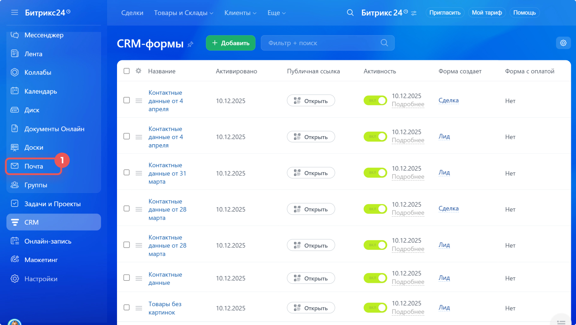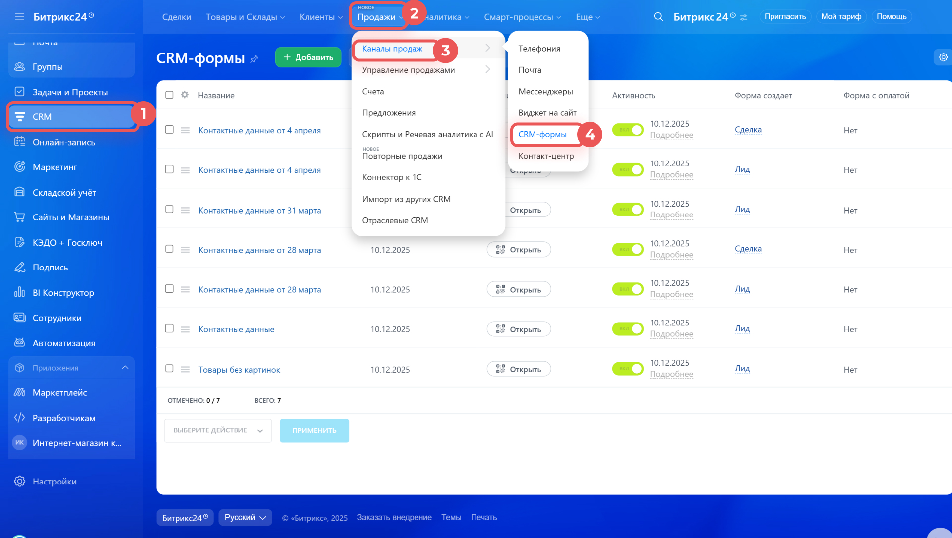 1–4. Перейдите в CRM > Продажи > Каналы продаж > CRM-формы.