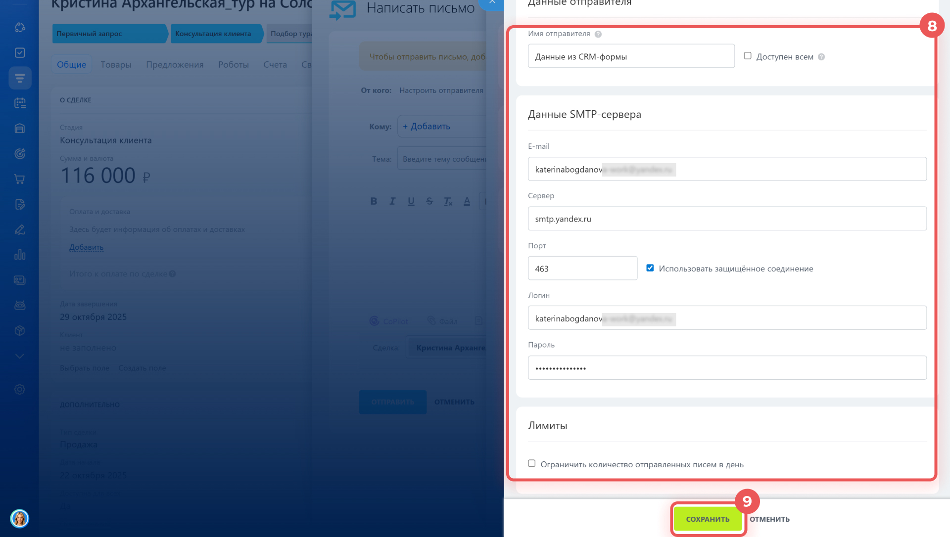 8–9. Заполните данные SMTP-сервера и нажмите Сохранить.