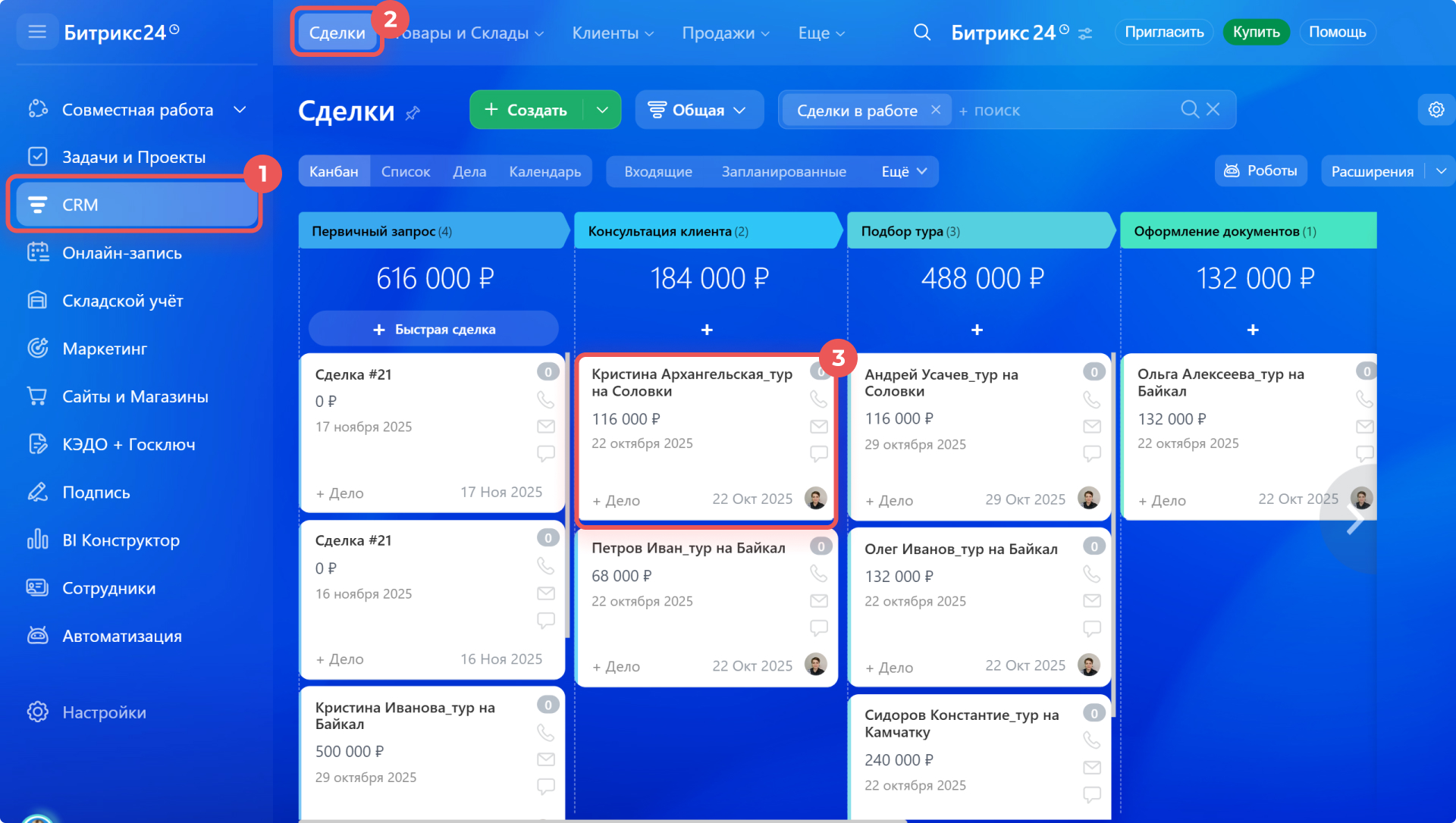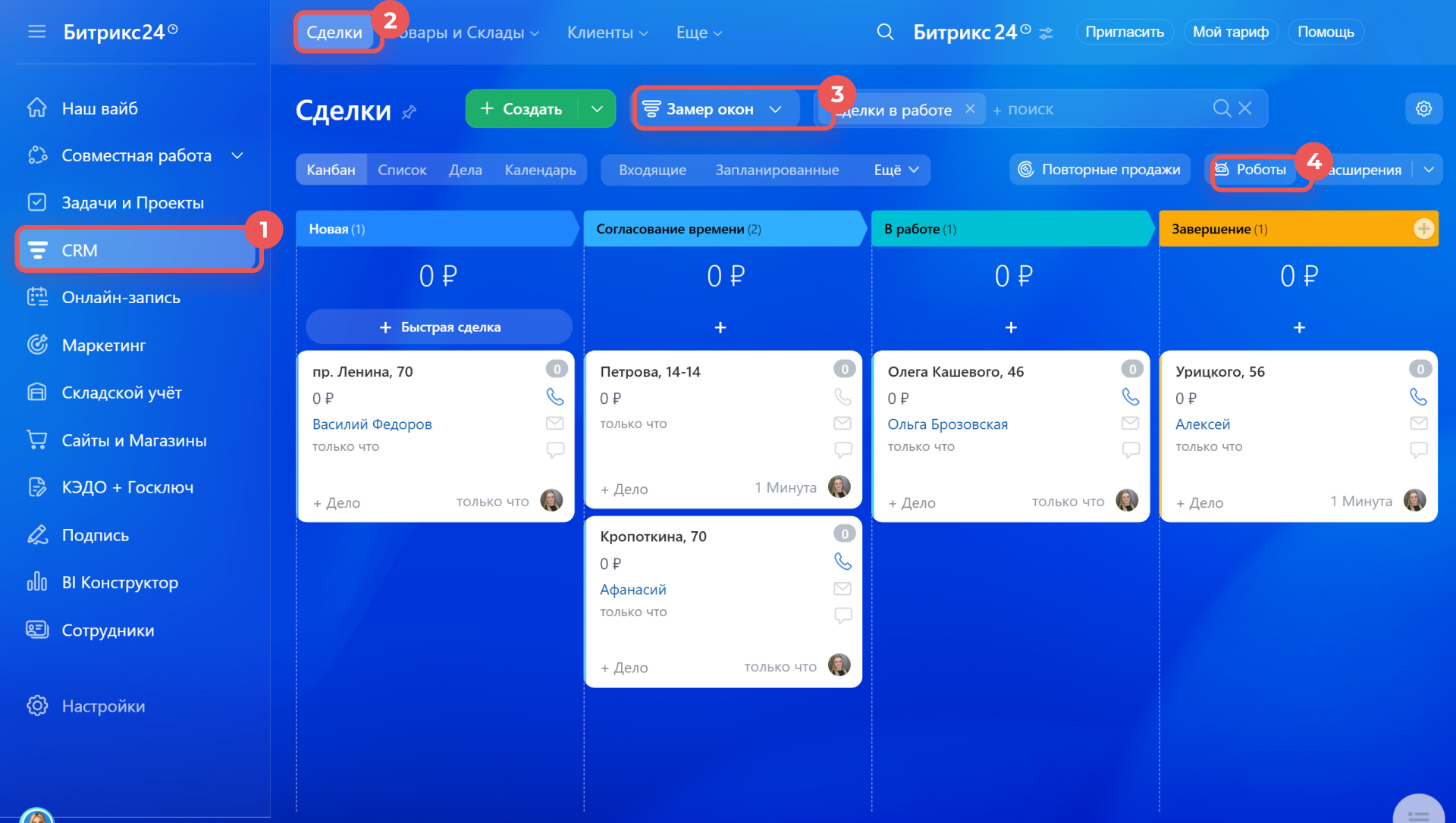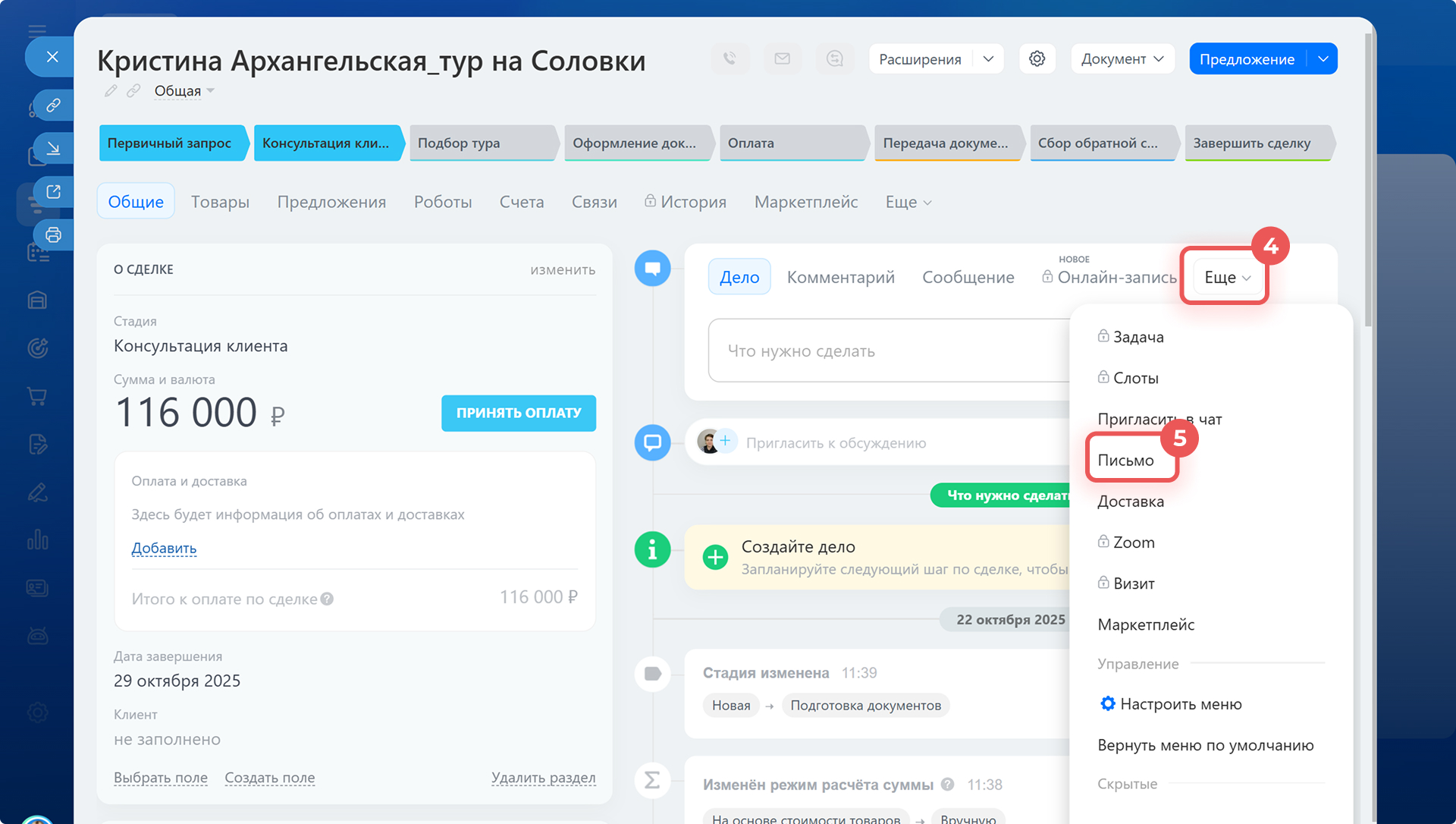 1–3. Перейдите в CRM > Сделки и откройте любую карточку.