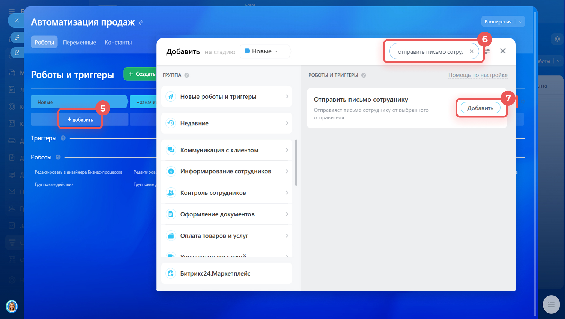 6–7. В строке поиска введите Отправить письмо сотруднику. Добавьте робота — откроется окно для настройки.