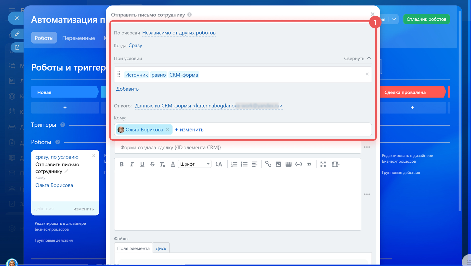 - От кого — выберите почтовый ящик, с которого робот отправит письмо сотруднику.