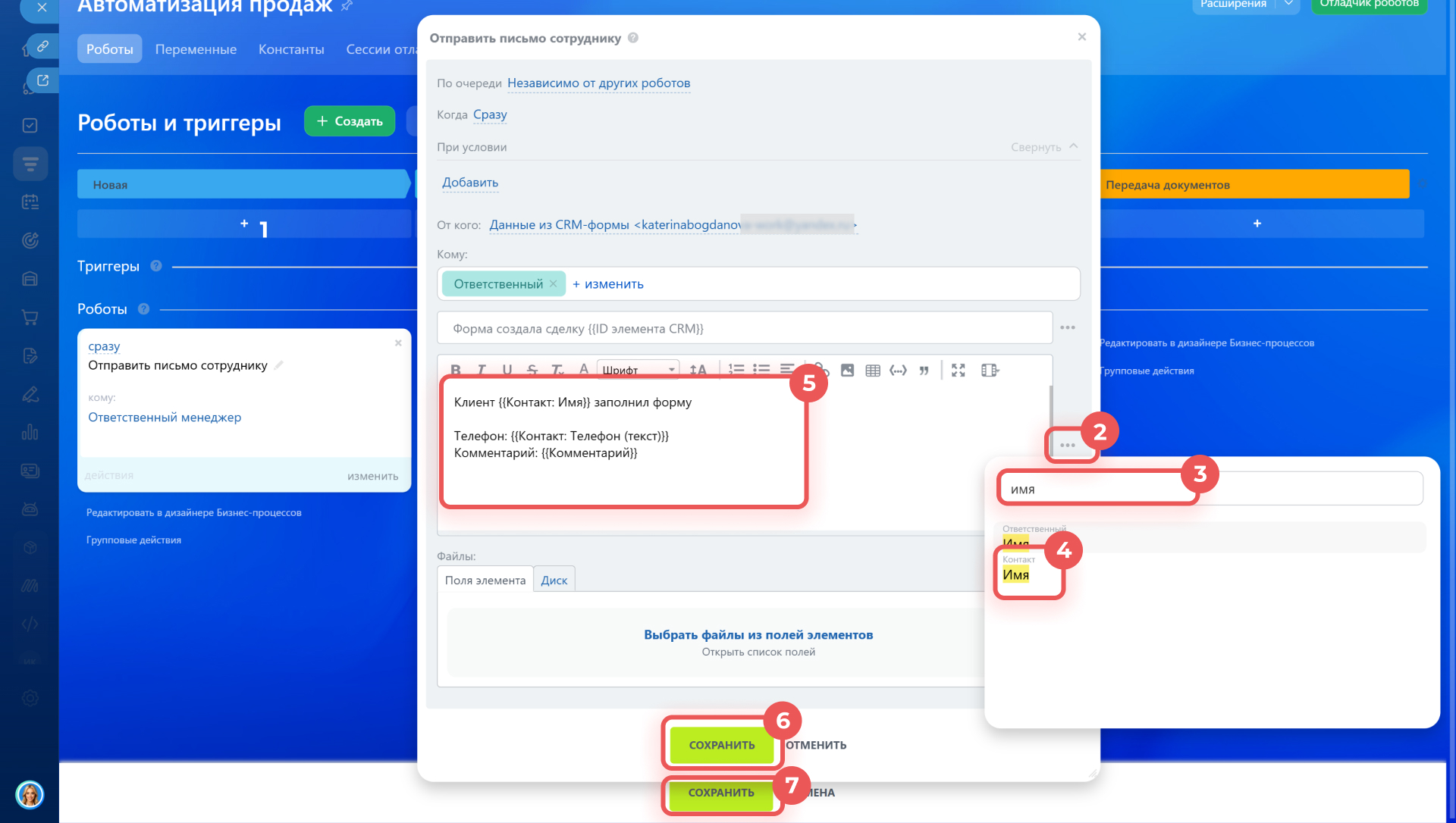- Настройте робота: укажите его параметры и добавьте в текст и тему письма значения полей из карточки CRM. Используйте поля из тех же элементов, что и в CRM-форме.