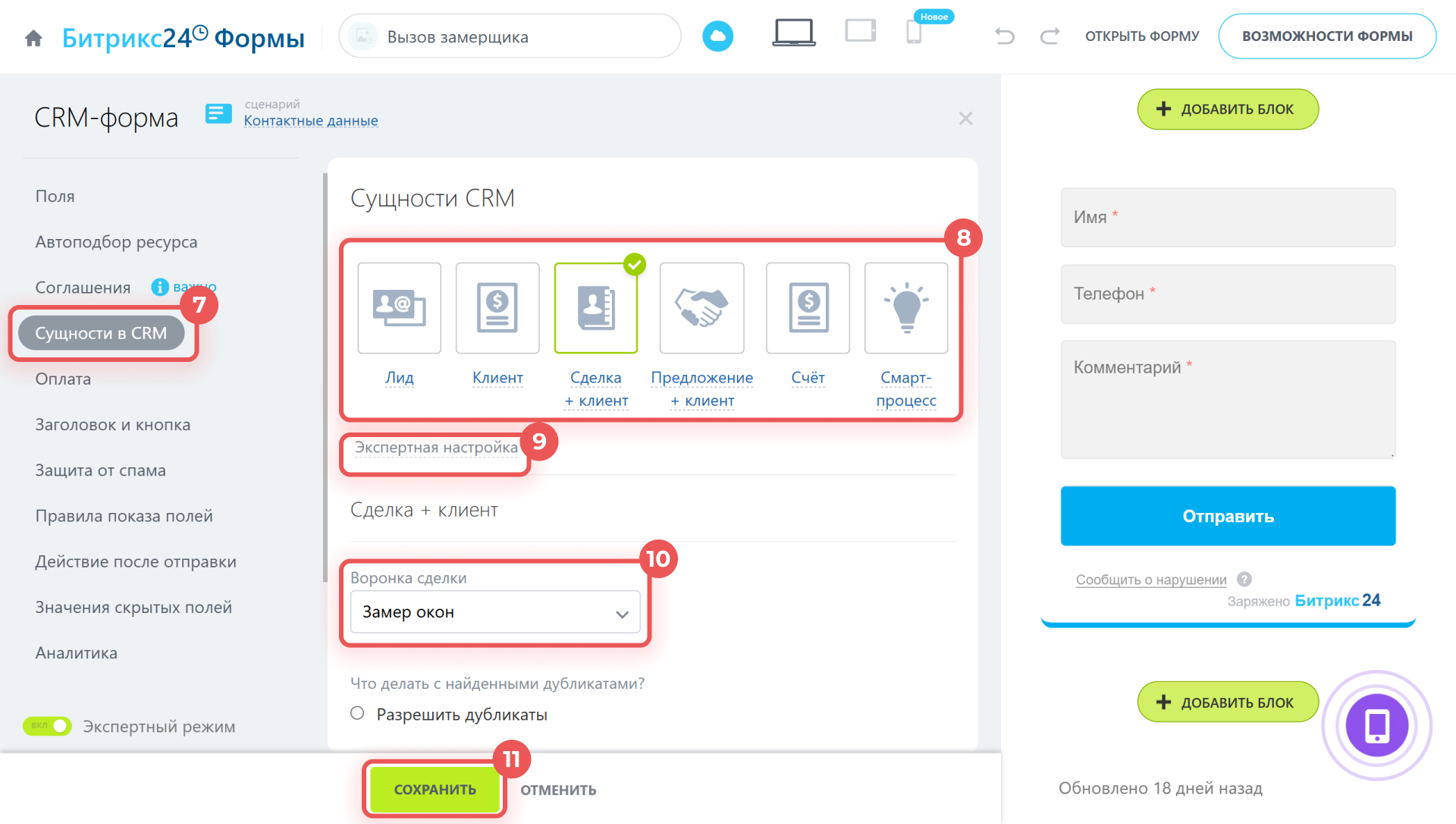 9–10. Если форма создает сделку или смарт-процесс, нажмите Экспертная настройка и выберите воронку, в которой будут появляться карточки.