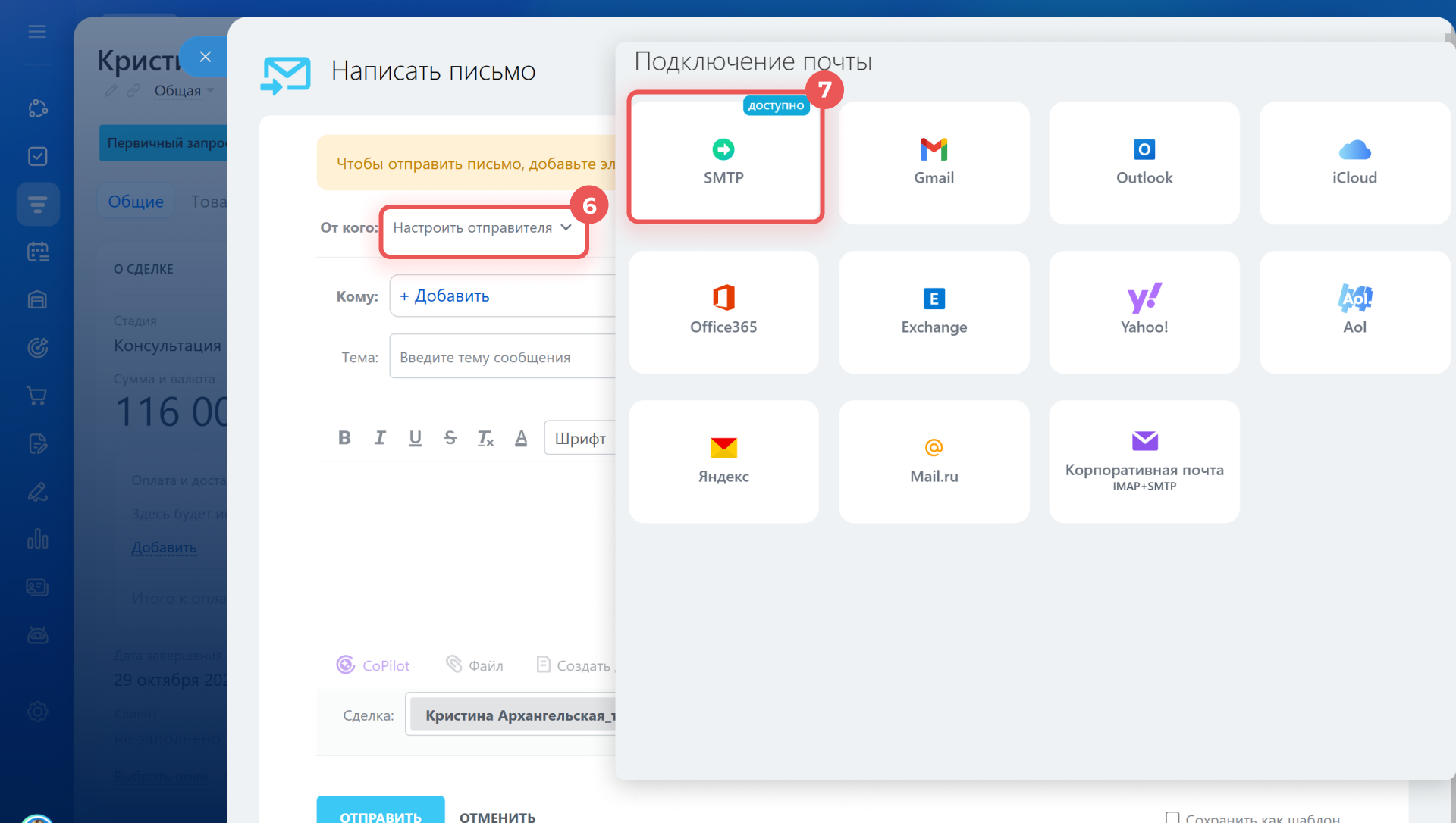 Опция «Настроить отправителя». Подключите через SMTP-сервер почтовый ящик для исходящих писем. Он не отобразится в разделе Почта и будет доступен только в списке отправителей. Настройка доступна в разделах Почта, CRM и Маркетинг.