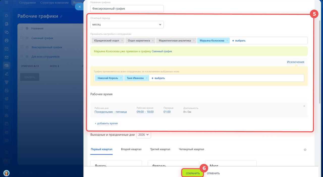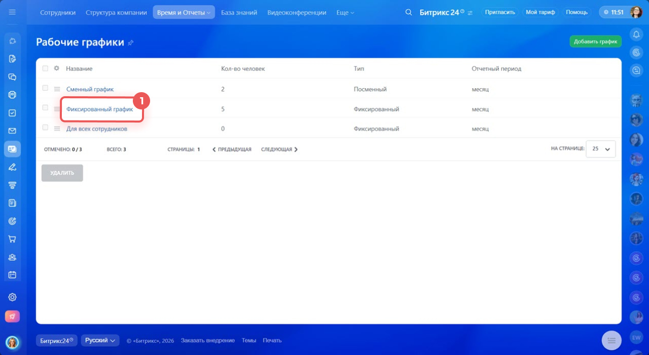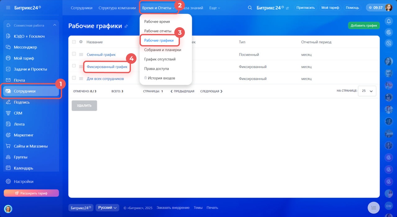 1–3. Перейдите в раздел Сотрудники > Время и отчеты > Рабочие графики.