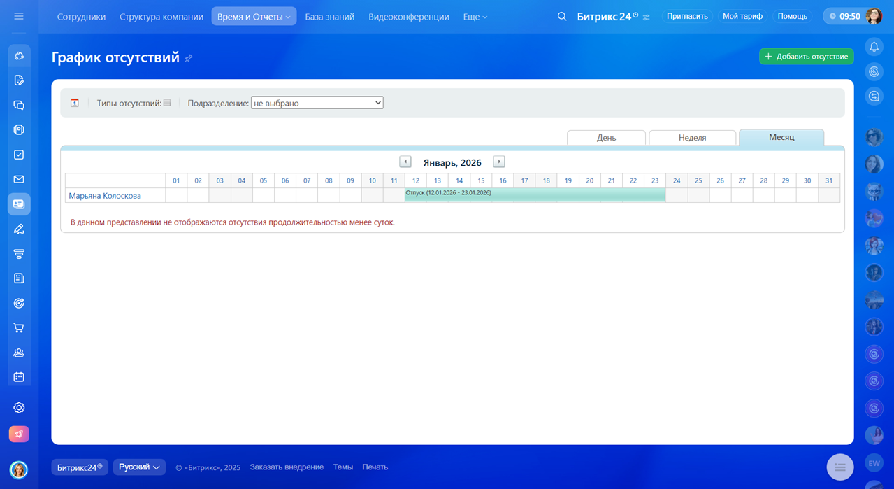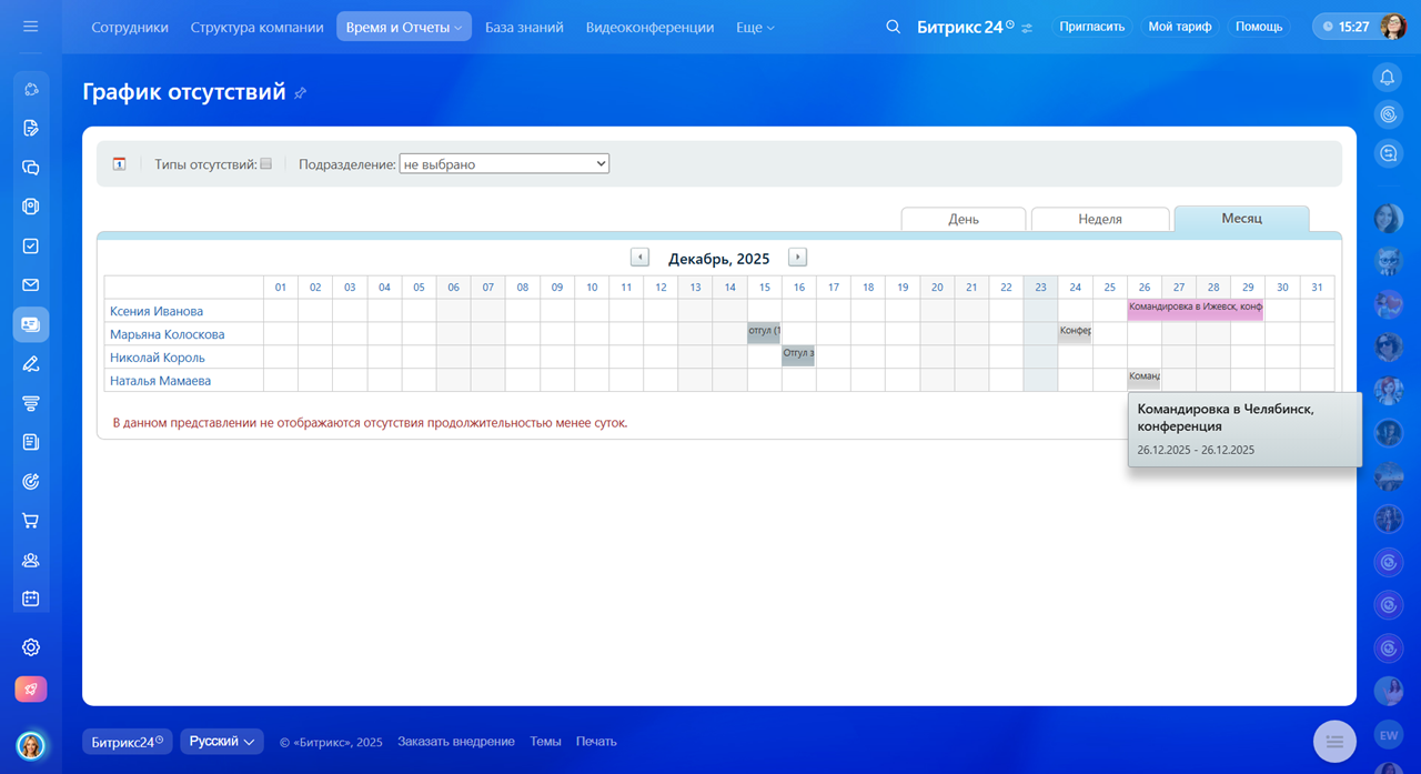 Графики отсутствий в коробочной версии Битрикс24
