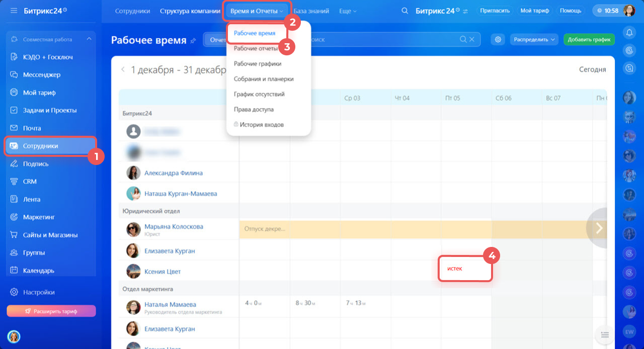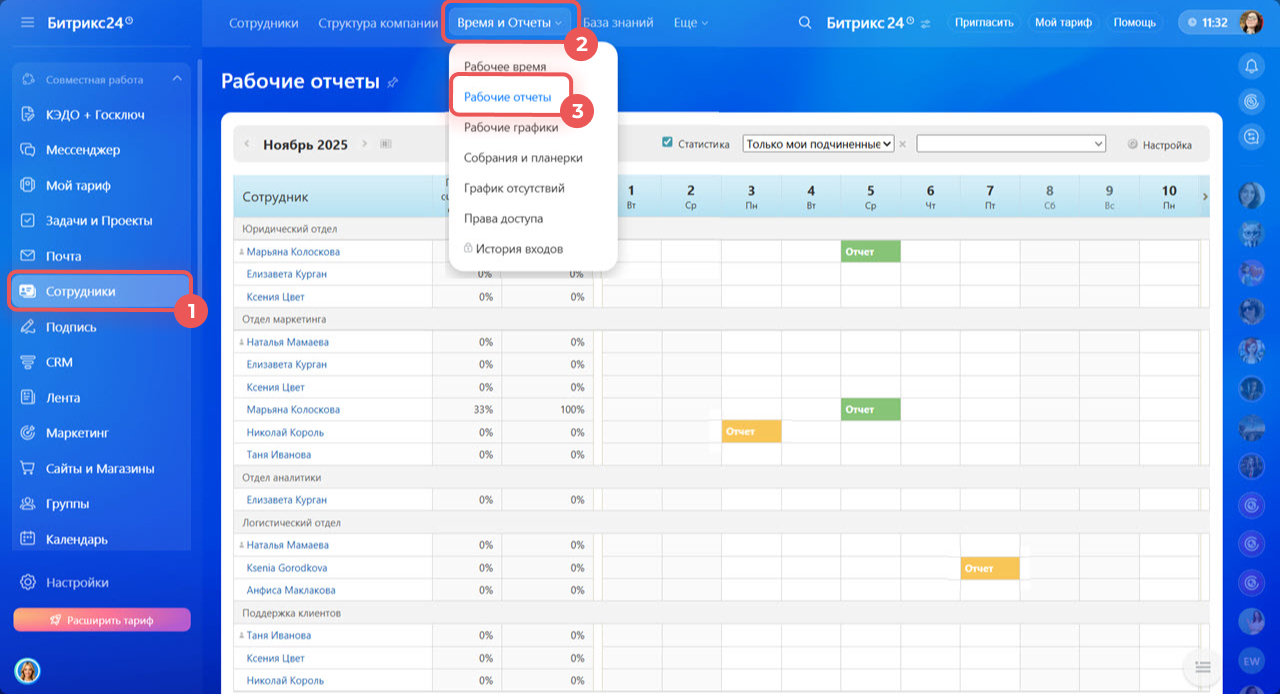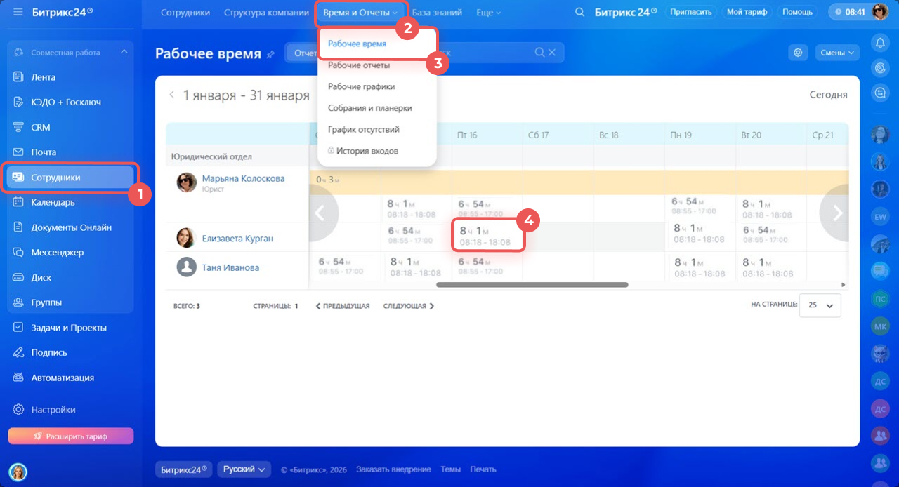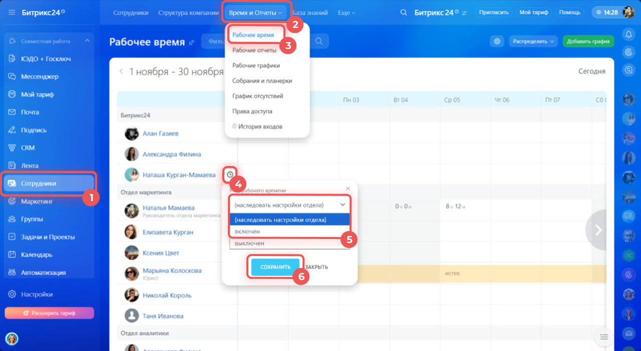1–3. Перейдите в раздел Сотрудники > Время и отчеты > Рабочее время.