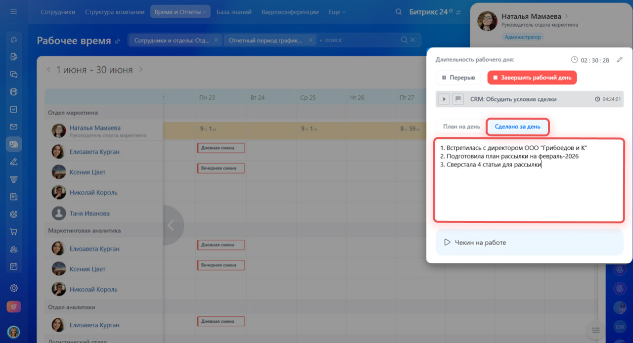 В Битрикс24 есть два инструмента для отчетов о работе сотрудника — «Сделано за день» в разделе Рабочее время и регулярный отчет в разделе Рабочие отчеты.