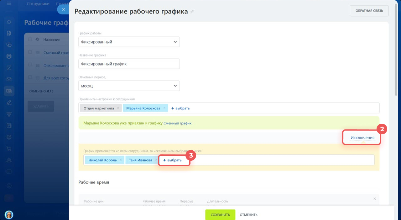 - К каким графикам привязан сотрудник. Если к нескольким, то добавить его в Исключения в других графиках, чтобы не было конфликта.