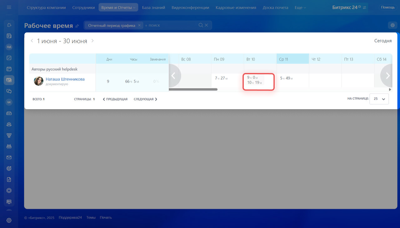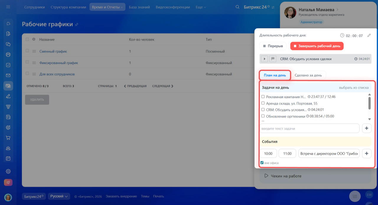 Учет ведется только если опция «Рабочее время и отчеты» включена в настройках вашего Битрикс24.