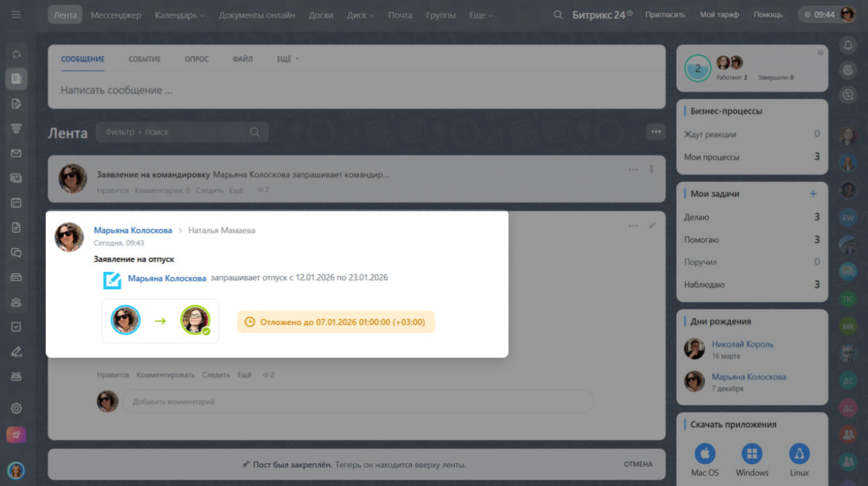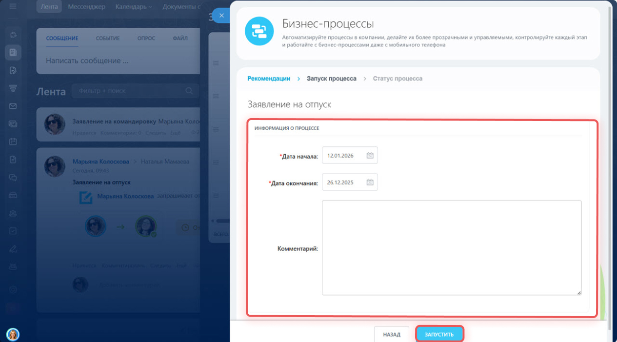 Бизнес-процессы. Нажмите Лента > Еще > Процессы. Выберите процесс, например Заявление на отпуск, и запустите его. Когда бизнес-процесс будет утвержден, отсутствие отобразится в графике.