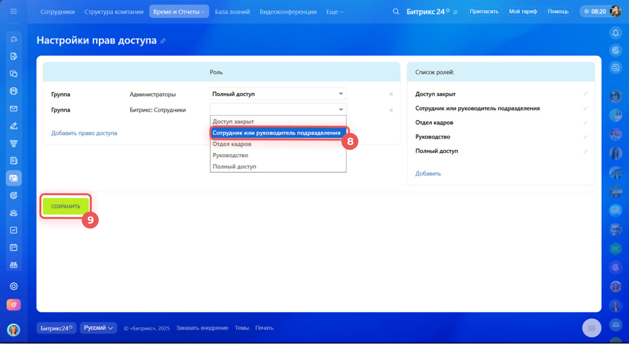 Проверить права доступа. Чтобы проверить, какие права доступа к учету рабочего времени есть у отдела или сотрудника: