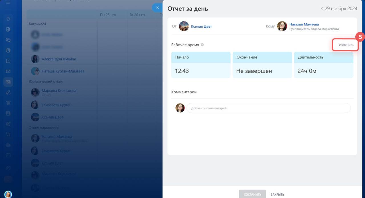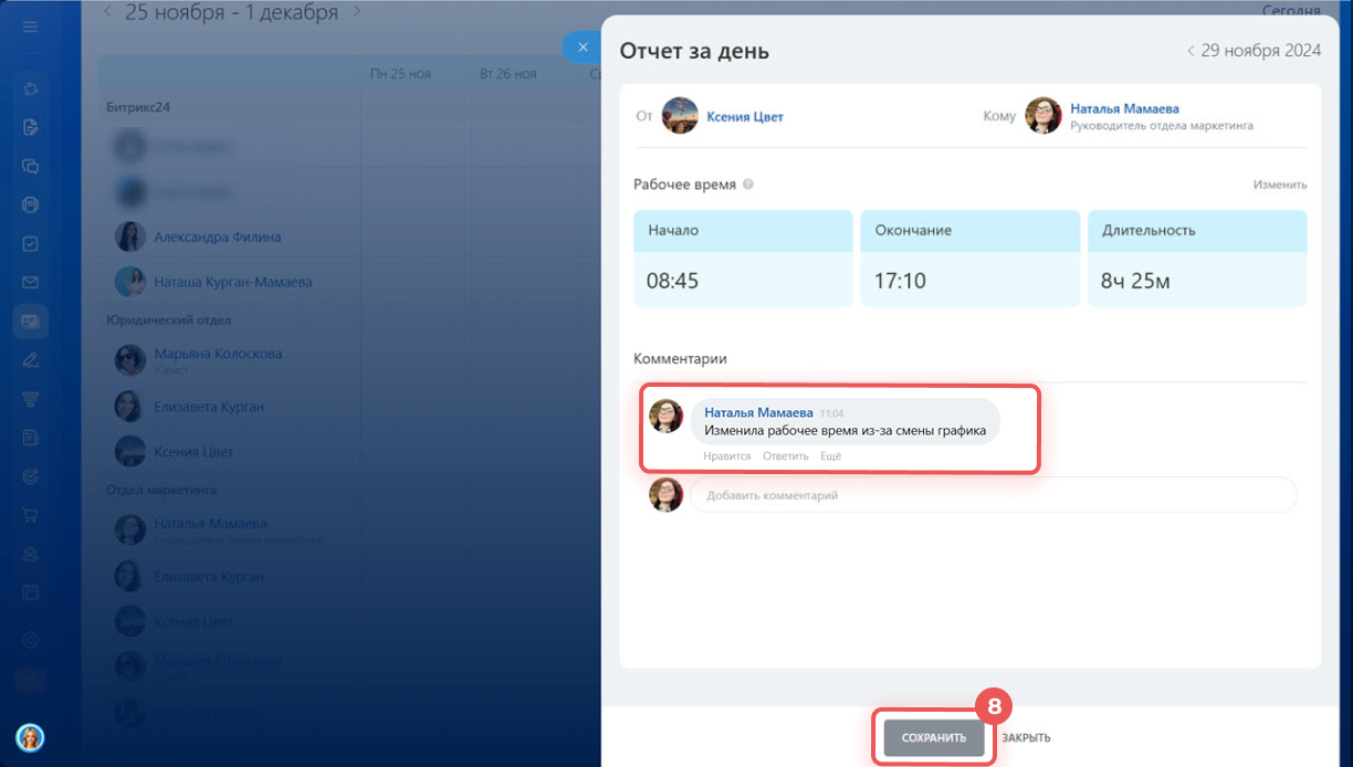8. Добавьте комментарий к записи, например «Перевели на новую смену». Сохраните изменения.