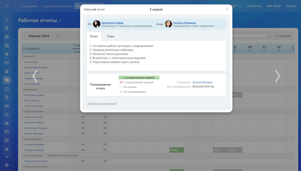После отправки рабочего отчета руководитель может его просмотреть и выставить оценку. Найти отчеты можно в разделе Сотрудники > Время и отчеты > Рабочие отчеты.