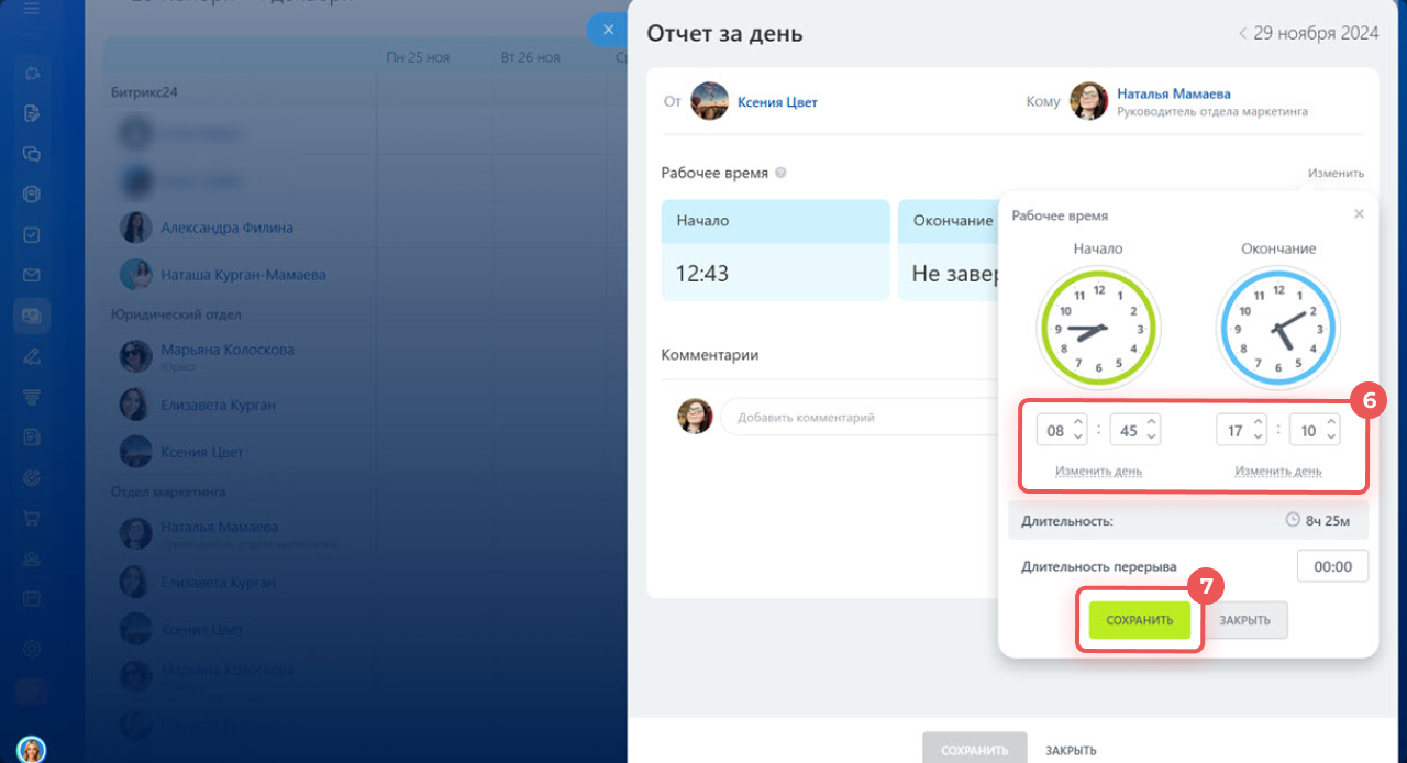 6–7. Укажите фактическое время начала работы или нужную дату. Нажмите Сохранить.