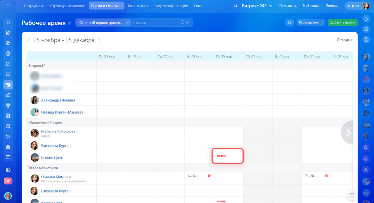Решение. В разделе Сотрудники > Время и Отчеты > Рабочие графики руководителю или администратору Битрикс24 нужно проверить: