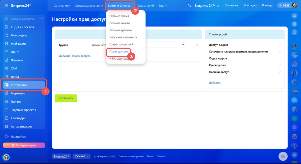 2–3. Нажмите Время и Отчеты > Права доступа.